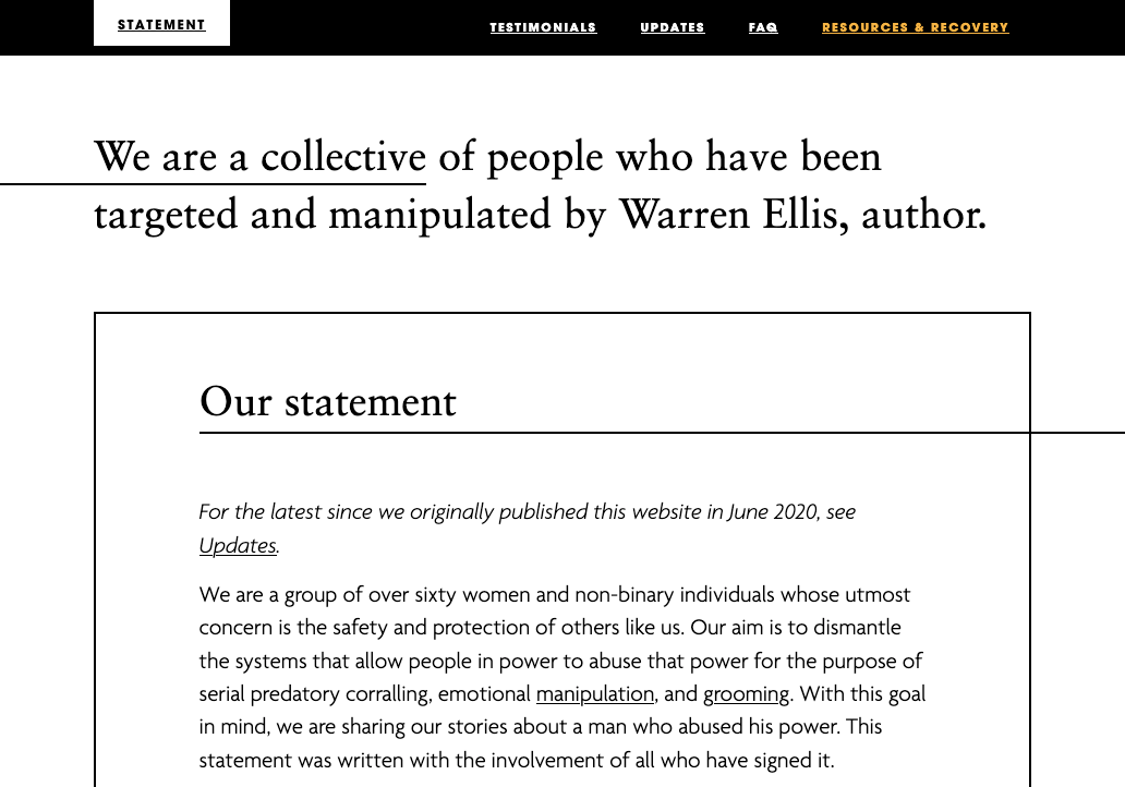 Over sixty individuals have come forward with their stories of Ellis’s behavior. After an initial, self-pitying nonpology, Ellis promised to work with his accusers to be better. As of 2023, though, SoManyOfUs reports that “A mediated accountability process with Warren Ellis is not possible at present, and we do not anticipate our involvement in any progress he might make in the future.”