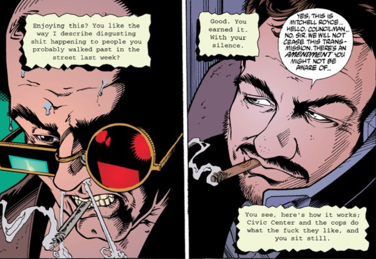 The majority of Transmetropolitan is an ongoing fight between Spider and the president of the United States. Their war starts local with a staged police riot that’s used as an excuse to claim some real estate. The US has a long history of police riots that continues to today — here’s an off-duty police officer at an anti-ICE protest in Phoenix staging assaults to get children arrested just last week.