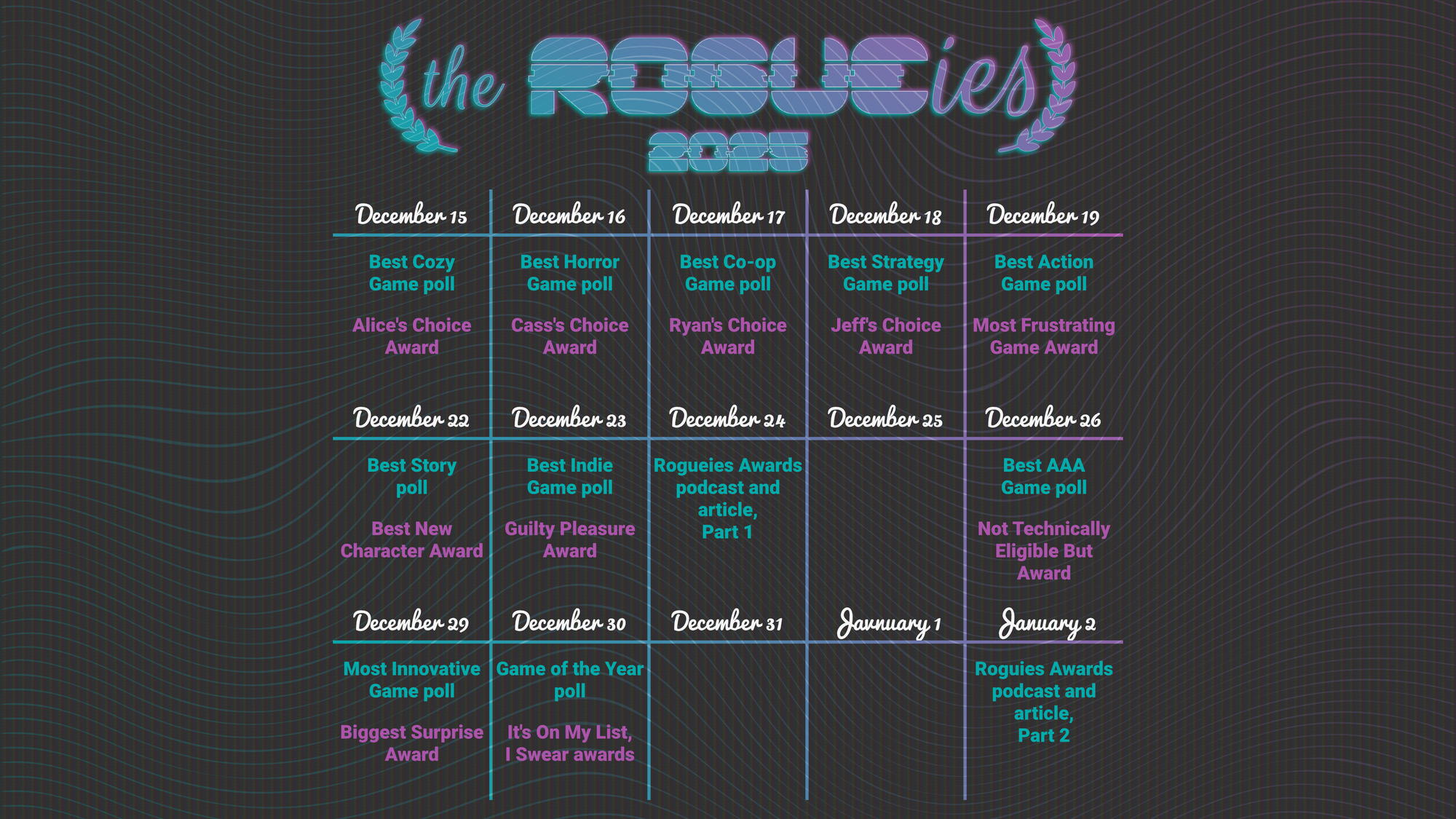 On Christmas Eve, we'll post our first The Rogueies special podcast and article, covering the first five Pierogi categories where we'll announce our winners. The second half, covering the rest of the awards and our Platinum Pierogi for GOTY, will go up on January 2.