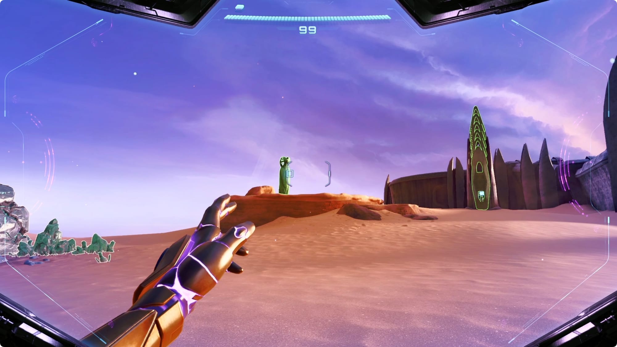 After your vaguely ovipositor-like railgun trip out of Fury Green (walkthrough pt.1), you’ll land in a mostly featureless desert. There's really only one thing nearby, so head toward the huge structure to the south (hey look, there’s a compass on the minimap in the upper right!).