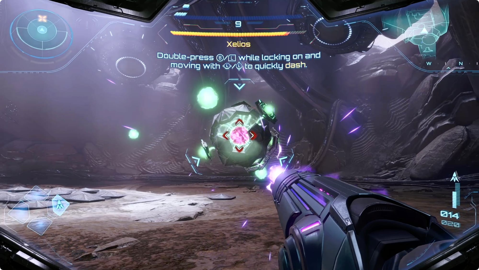 The biggest things to watch for are the (mercifully rare) attacks that you have to dodge. These are massive attacks that will drain your health. They’re also pretty obvious when Xelios starts charging them. Whenever you see something big charging up, lock on with ZL and start strafing sideways. Get ready to double tap B (jump), and use it to dodge at the last second. You won’t get it every time, but those green orbs drop lots of health.