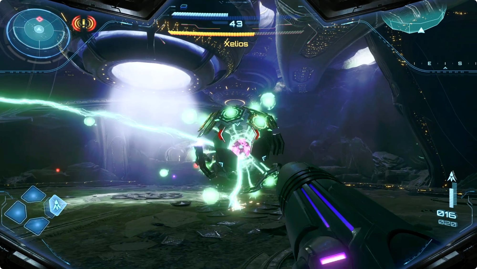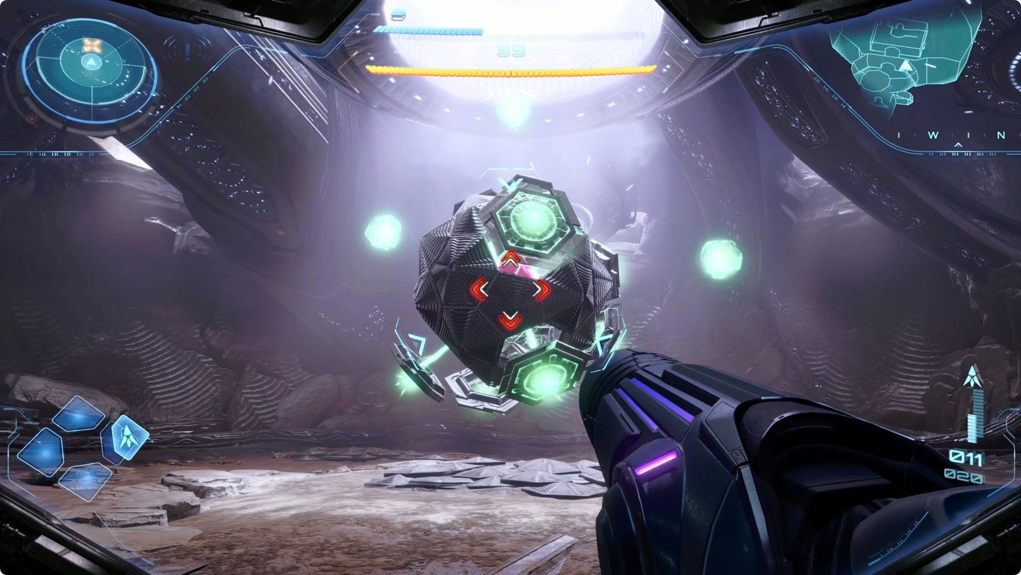 First thing to know if that you can’t damage Xelios’ shell unless the panel you’re aiming at is glowing green. The next thing to know is that if you destroy too much of the shell, Xelios will basically reset. The last thing to know is that all of the green orbs that Xelios shoots at you can be shot — and often drop health and ammo when you do.