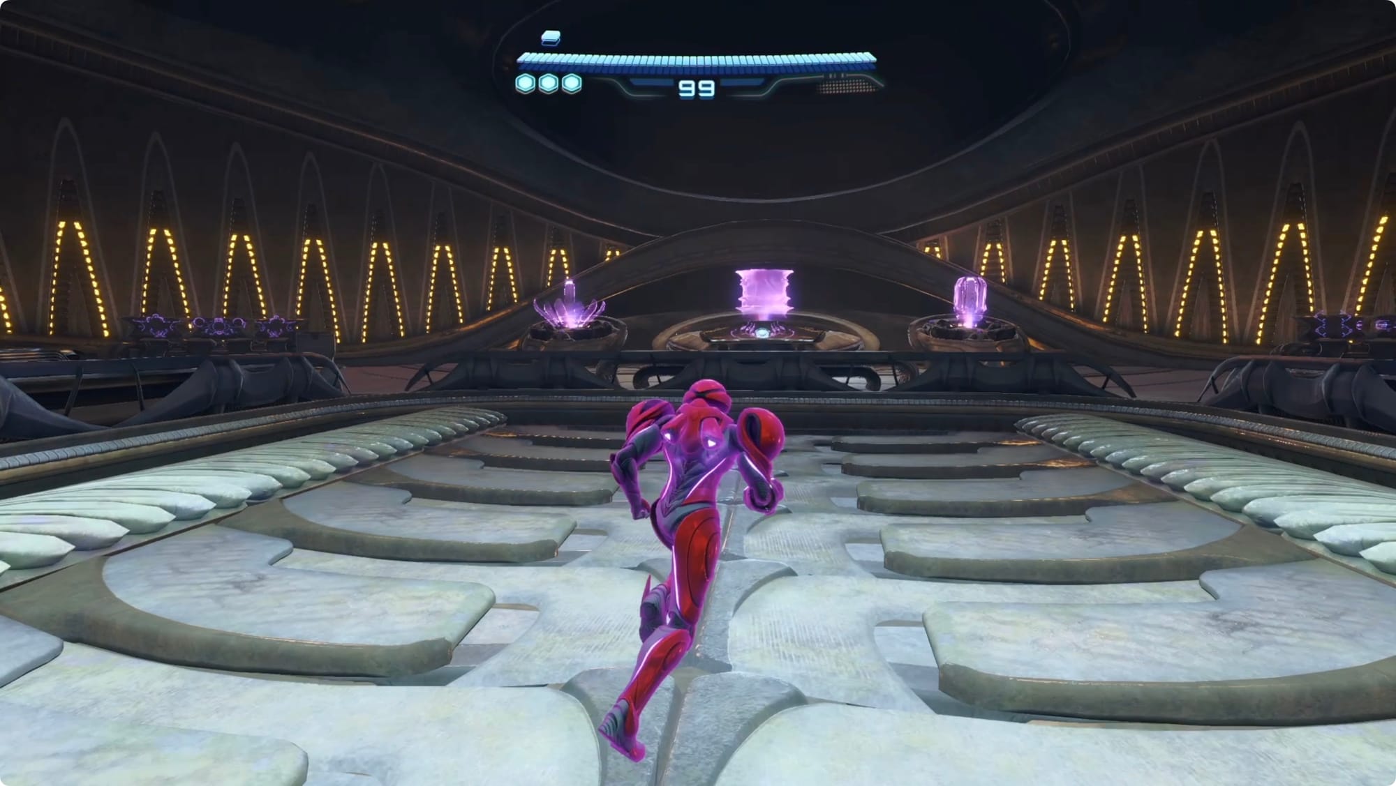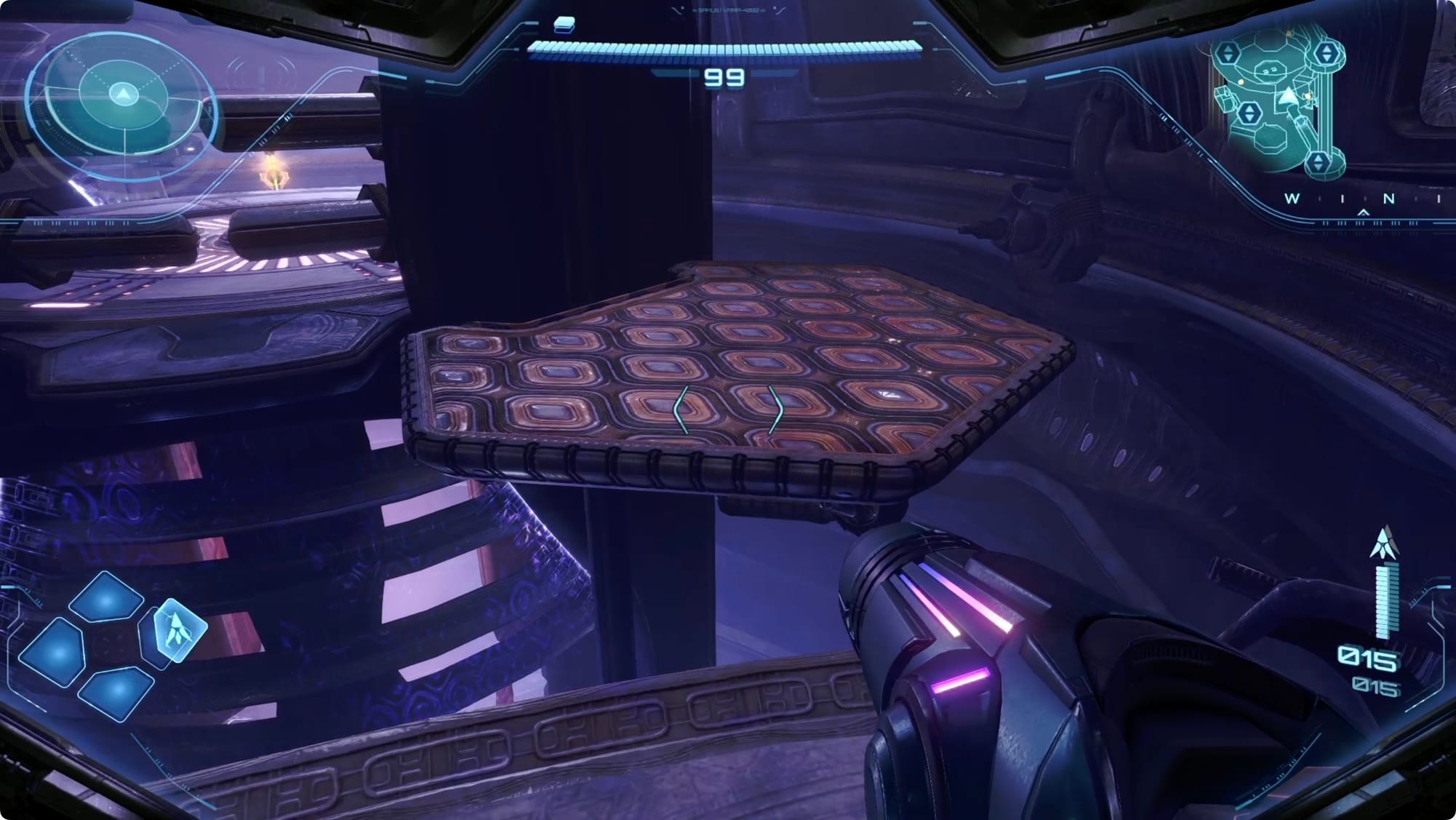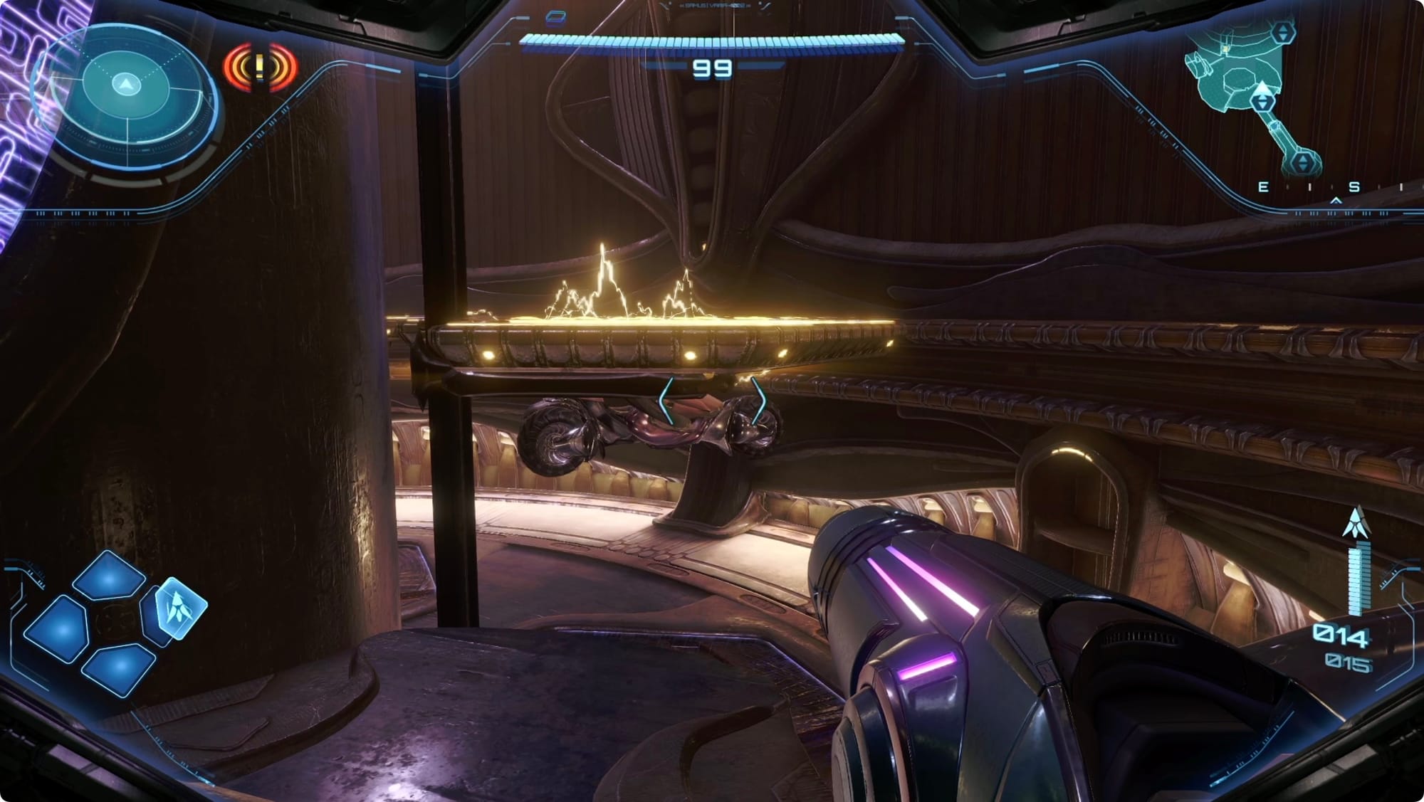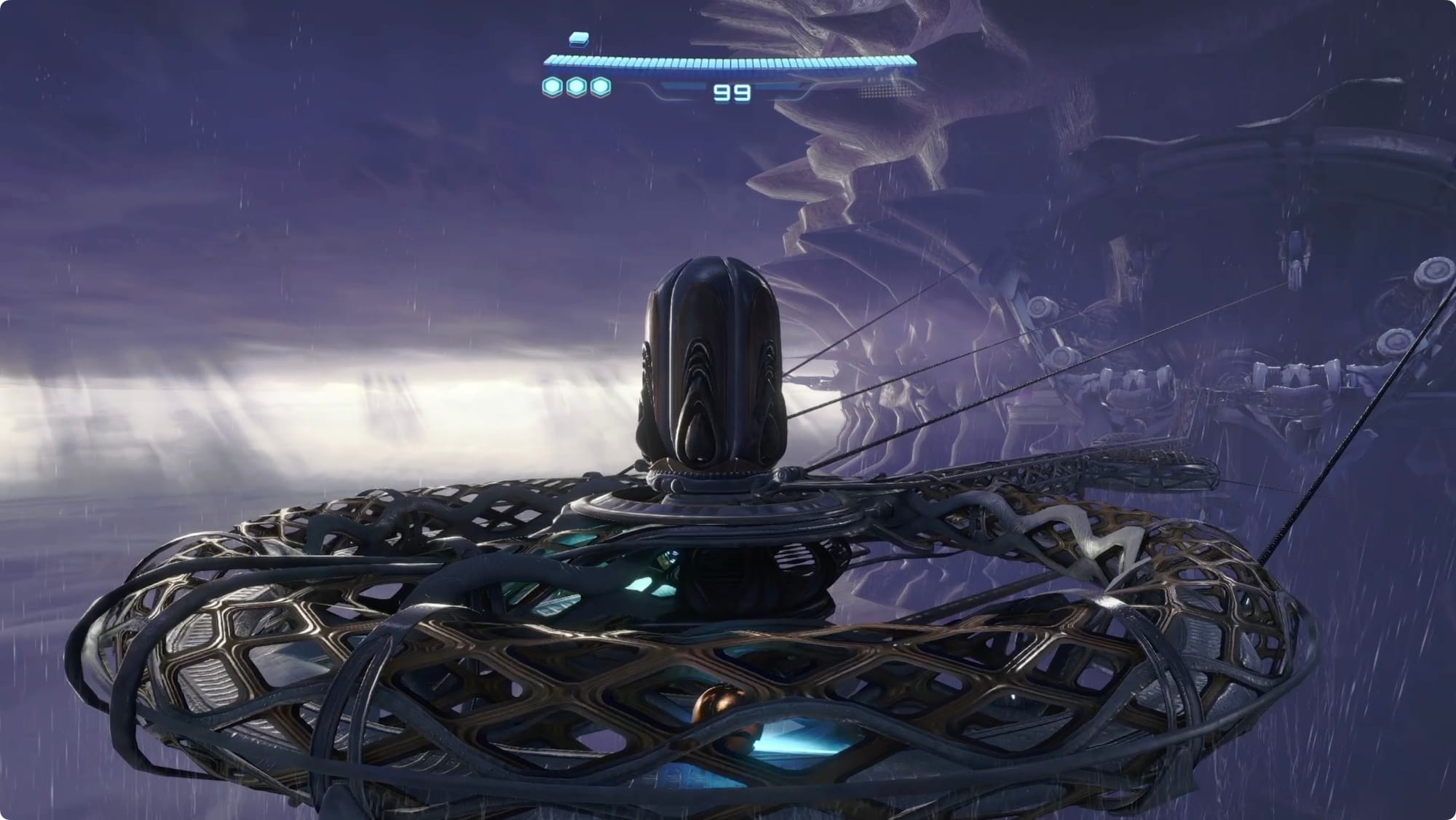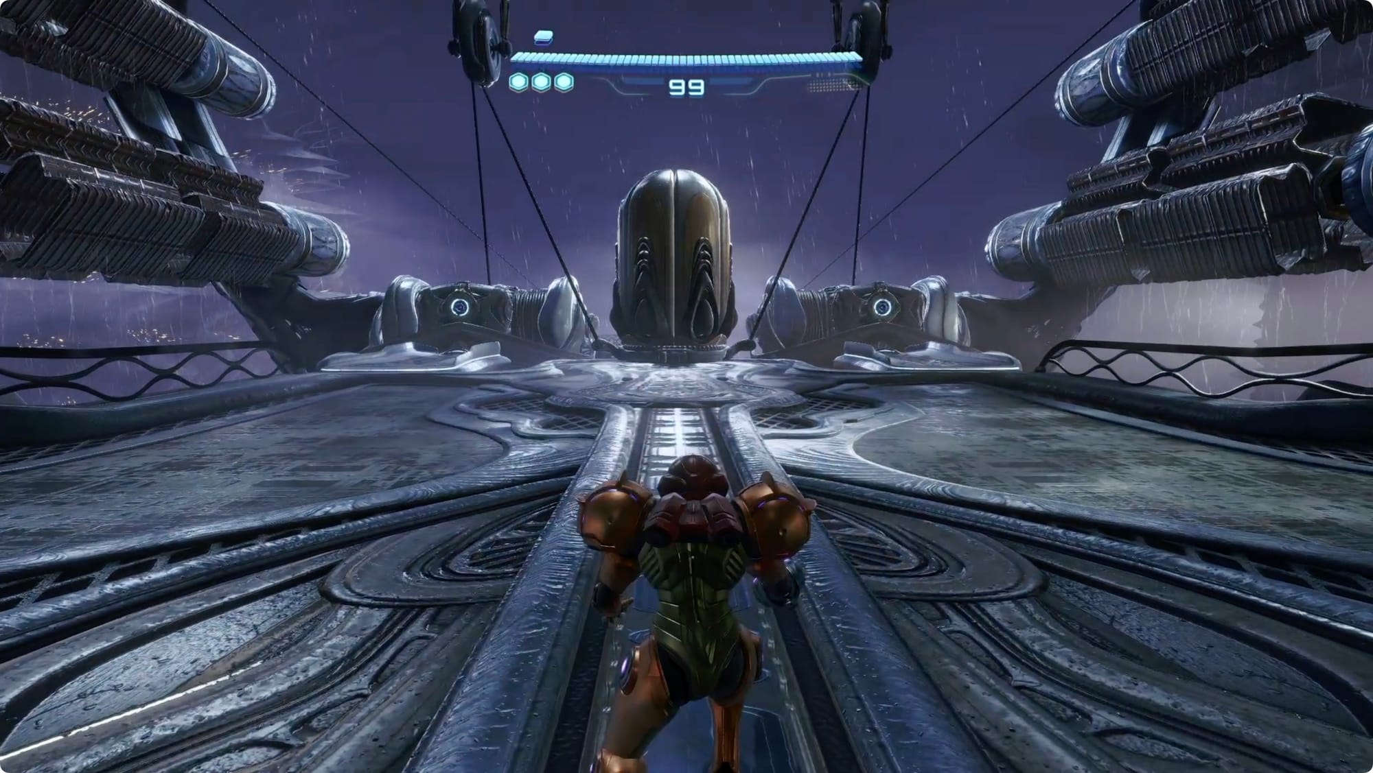 Stand on the platform closest to the railing gap and pilot a Control Beam shot to charge the power socket to make the jump. Head through the next door to find another elevator. Take it down.