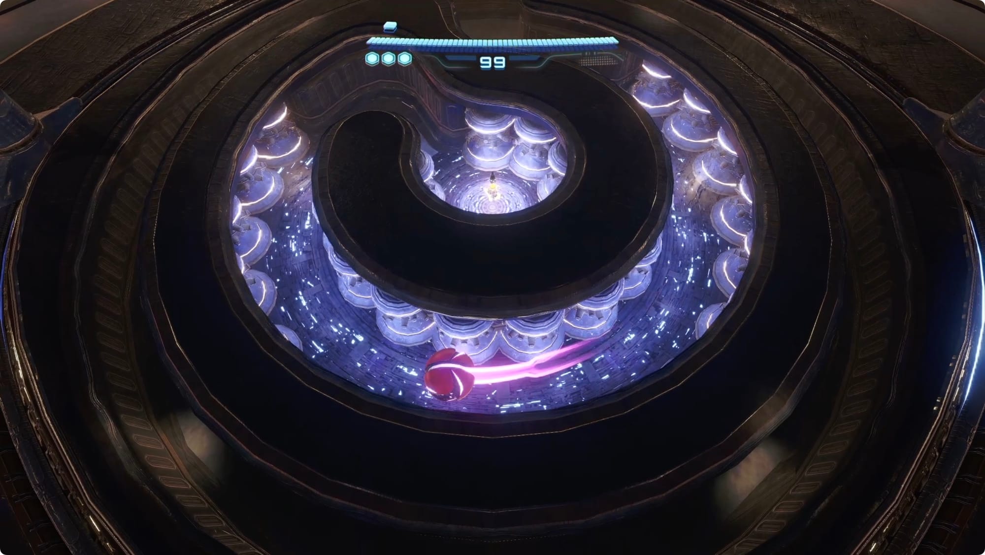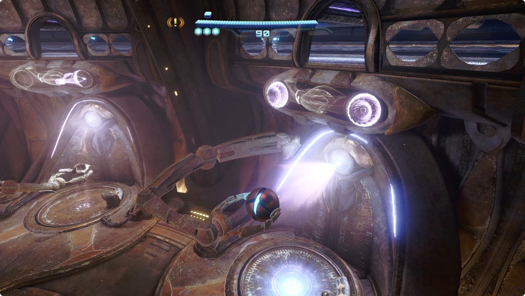 Switch to Morph Ball and place yourself in one of the printers — the one printing wheels makes sense since you’re mostly wheel-shaped. Avoid the electricity on the track you land on, and work your way around to the exit. Take the elevator up.