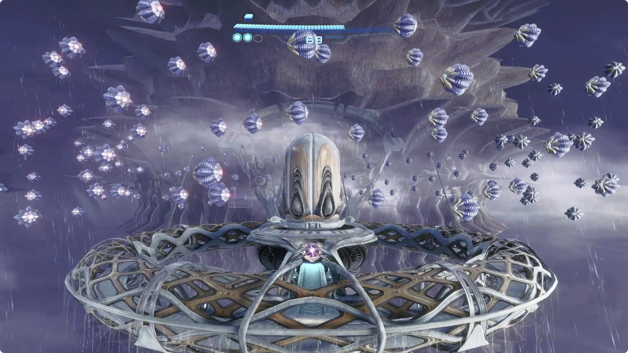 So. All you have to do is avoid the orbs Xelios fires, shoot the orbs Xelios fires, target only certain panels of its armor but not too many of them, watch out for the attacks you have to dodge, charge your beam weapon to vacuum up all the drops, and dish out as much damage as you can to Xelios’ glowing nucleus. Easy peasy.