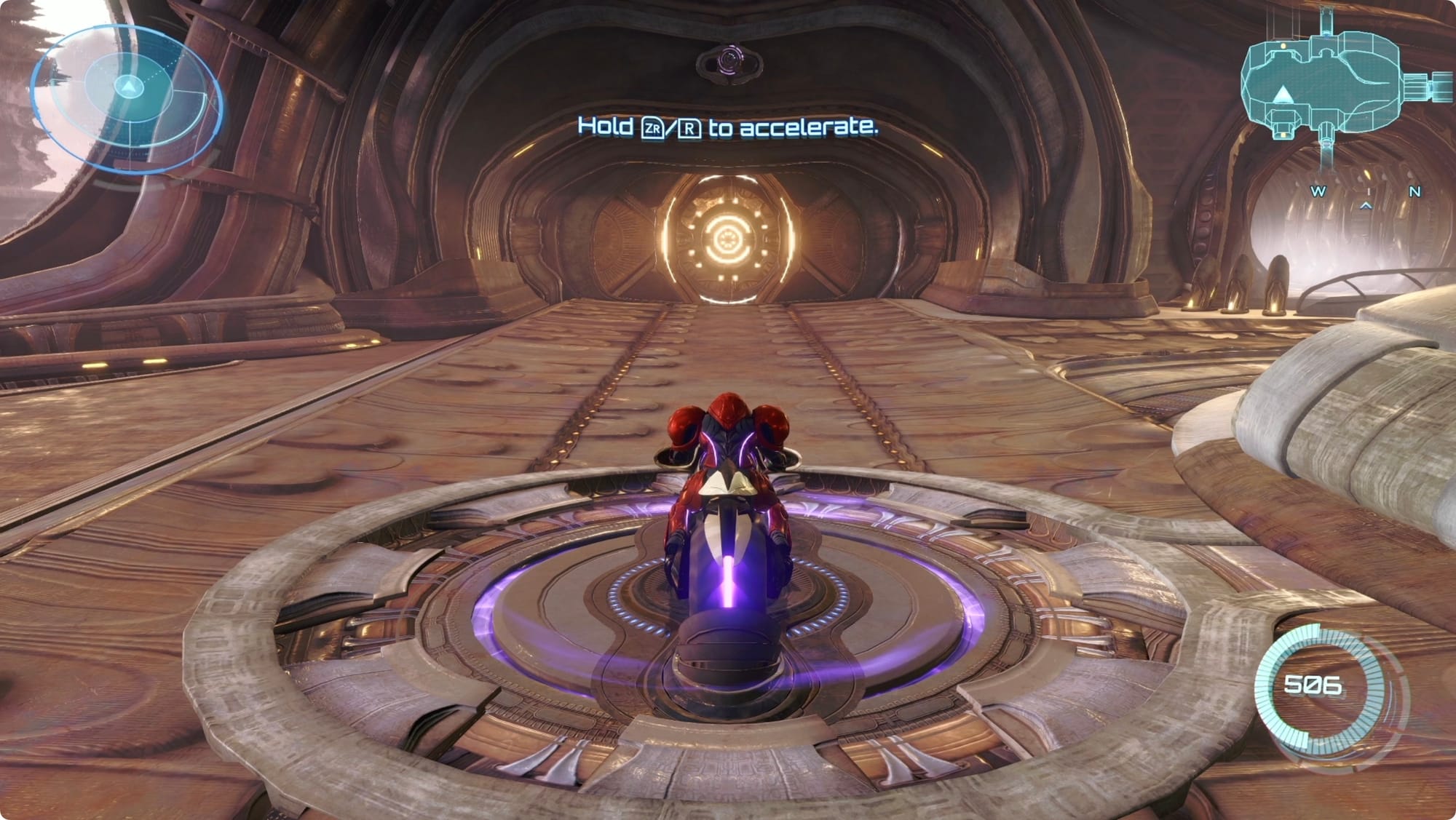 Keep backtracking all the way back to the map room. This time, you can use the terminal to get the Vi-O-La Suit. Hit the Save Station before you grab your new bike. If you do hop on because you were too excited, + will dismount (you won’t get that tooltip right away), but we’re also headed to another Save Station almost immediately.