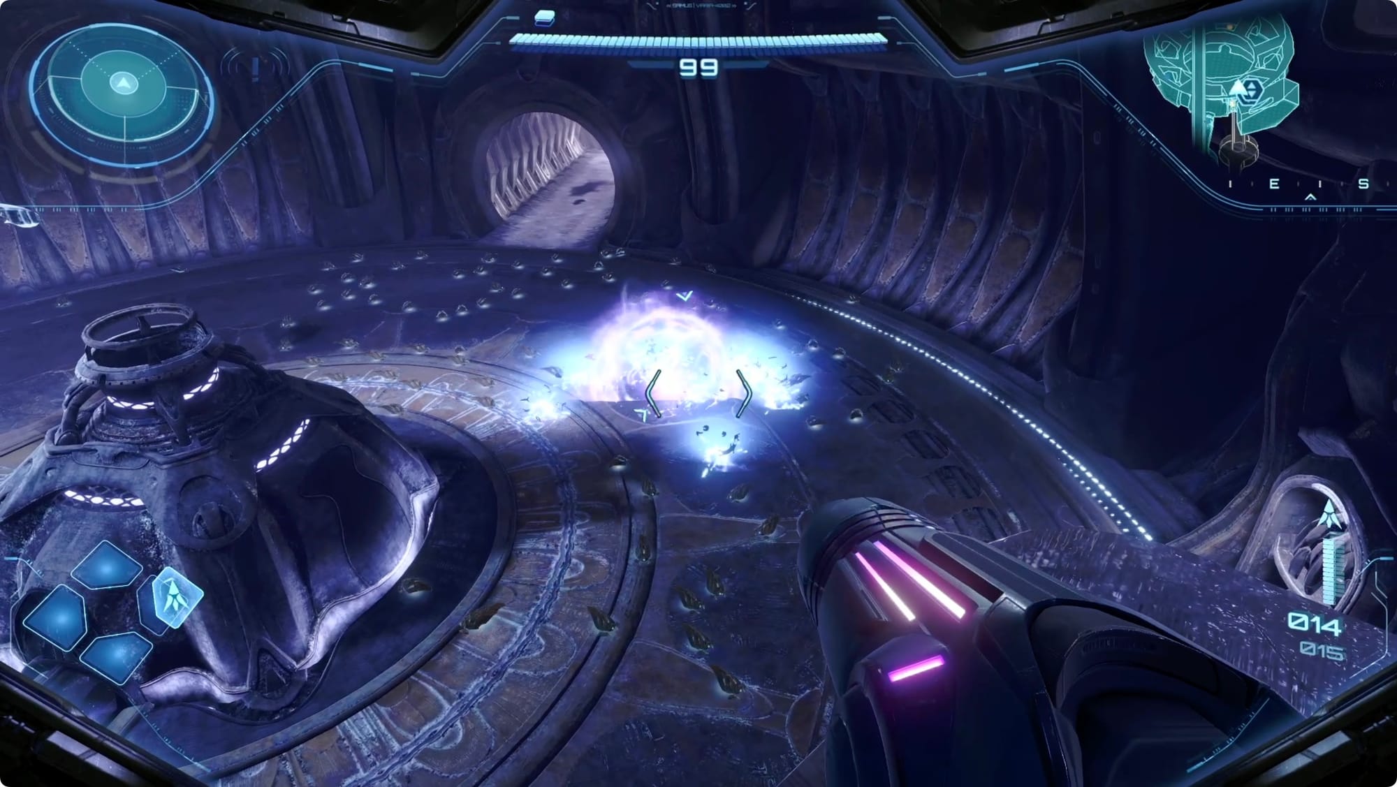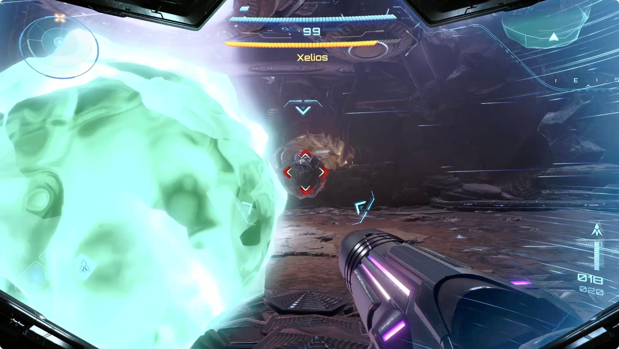 Sarcasm aside, the key to this fight is to take it slow and relax. If you get too frazzled or focused on one thing, it can go sideways fast. Work on opening up a hole in the armor first and get some damage through the gap. Practice charging your arm cannon for most of the shots — this does double duty as extra damage and loot vacuum. If you want, you can even switch over to Psychic Visor and fire a Control Beam for some more fine-tuned aiming.