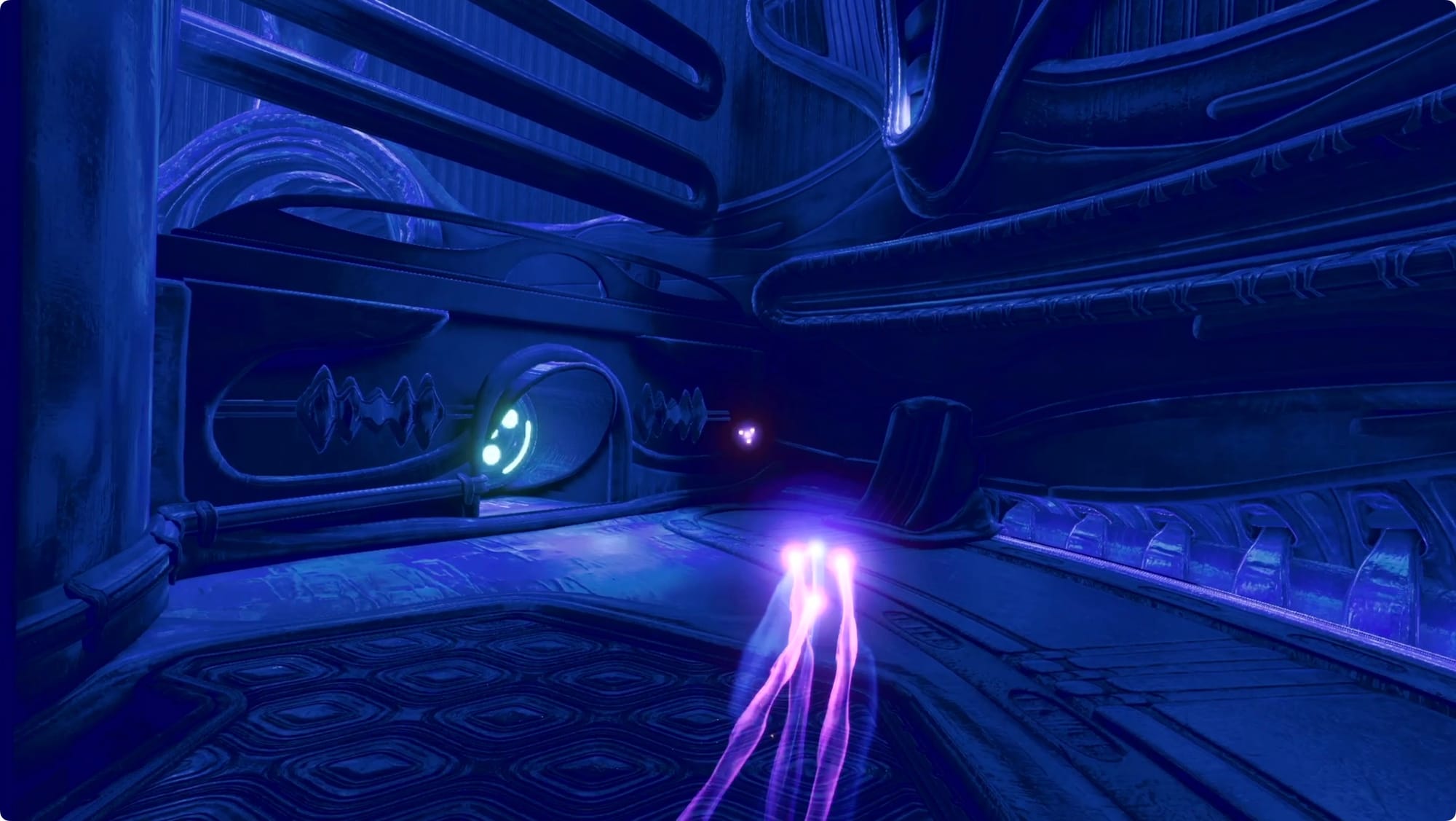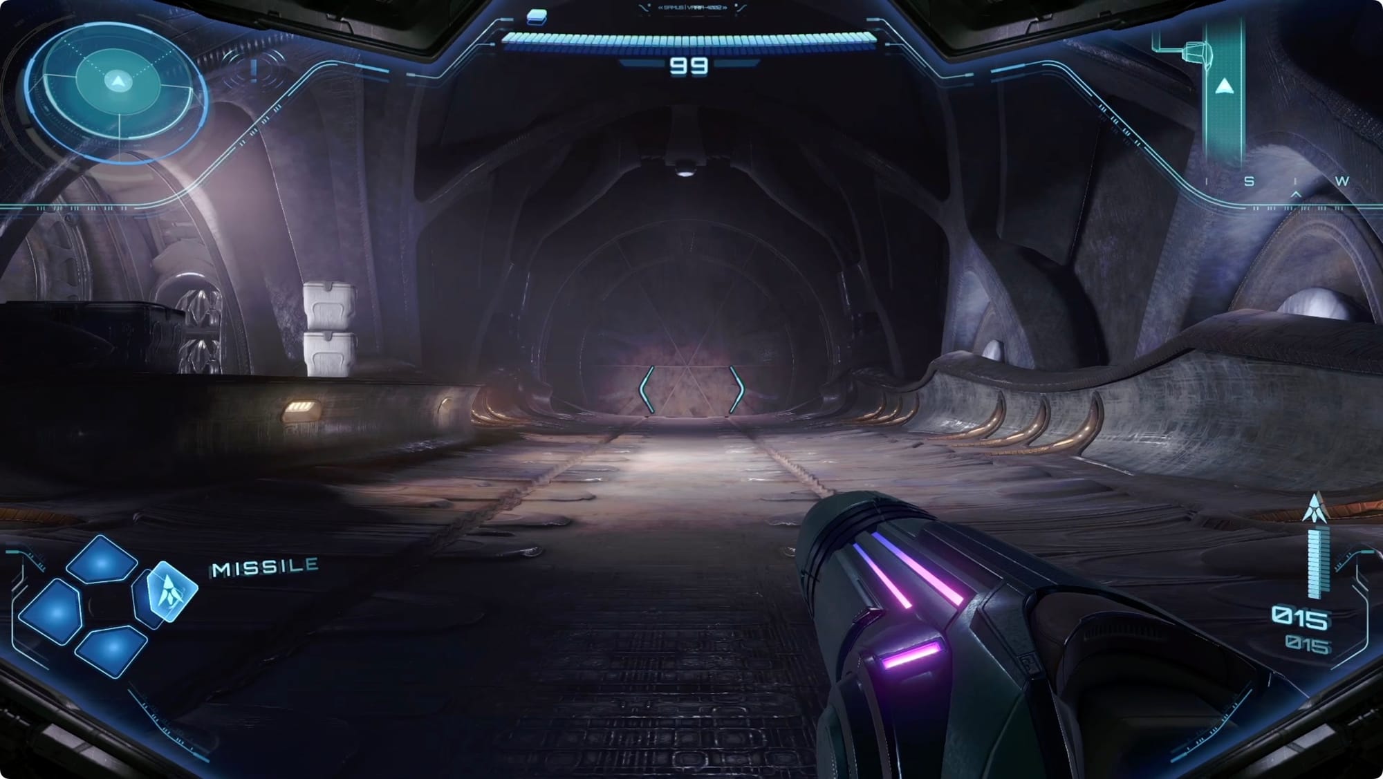 When you land, the short end of the hallway behind you leads (I think) back out through the Vi-O-La Hatch you scanned earlier. The long end is the way we’re going. At the far end, hop into the alcove on the left.
