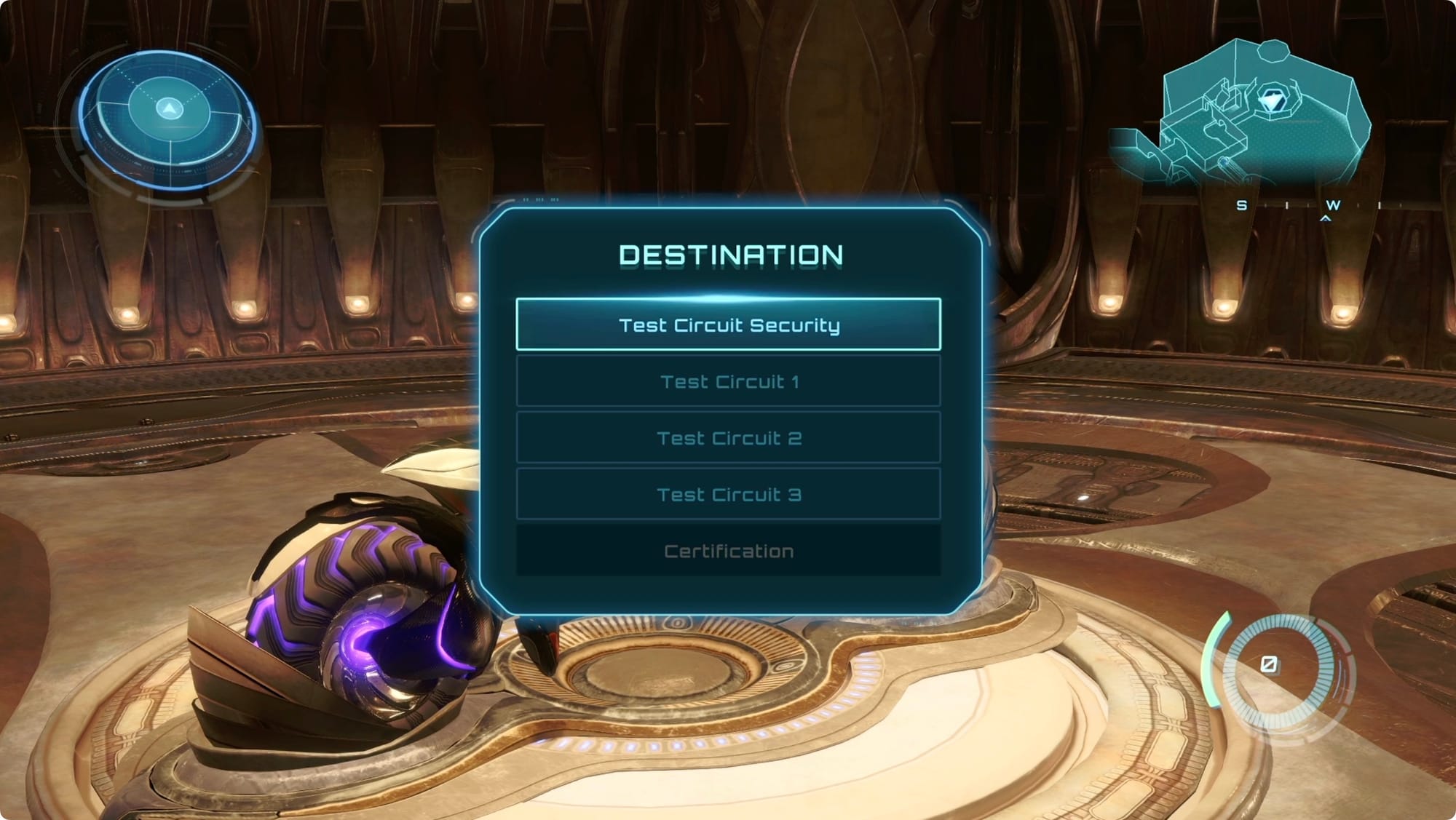Double jump your way out of the room and all the way back to the Vi-O-La elevator. When given the option, take it up to Test Circuit Security. Hit the Save Station when you get there.