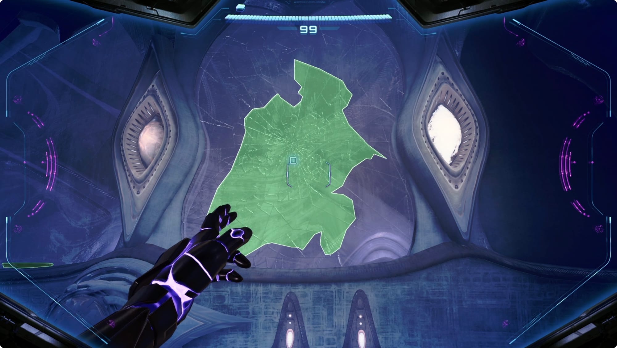In the first room, scan the terminal for the Area Map. Loop around to the room on the northeast wall to find another Save Station.