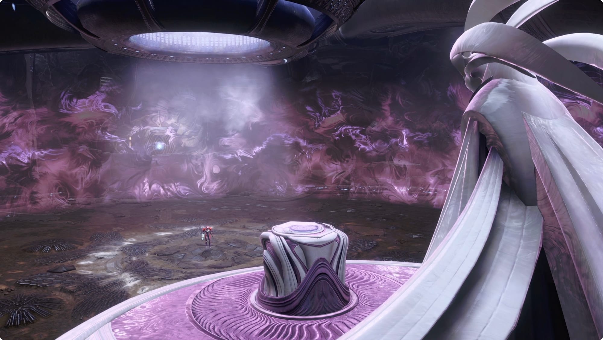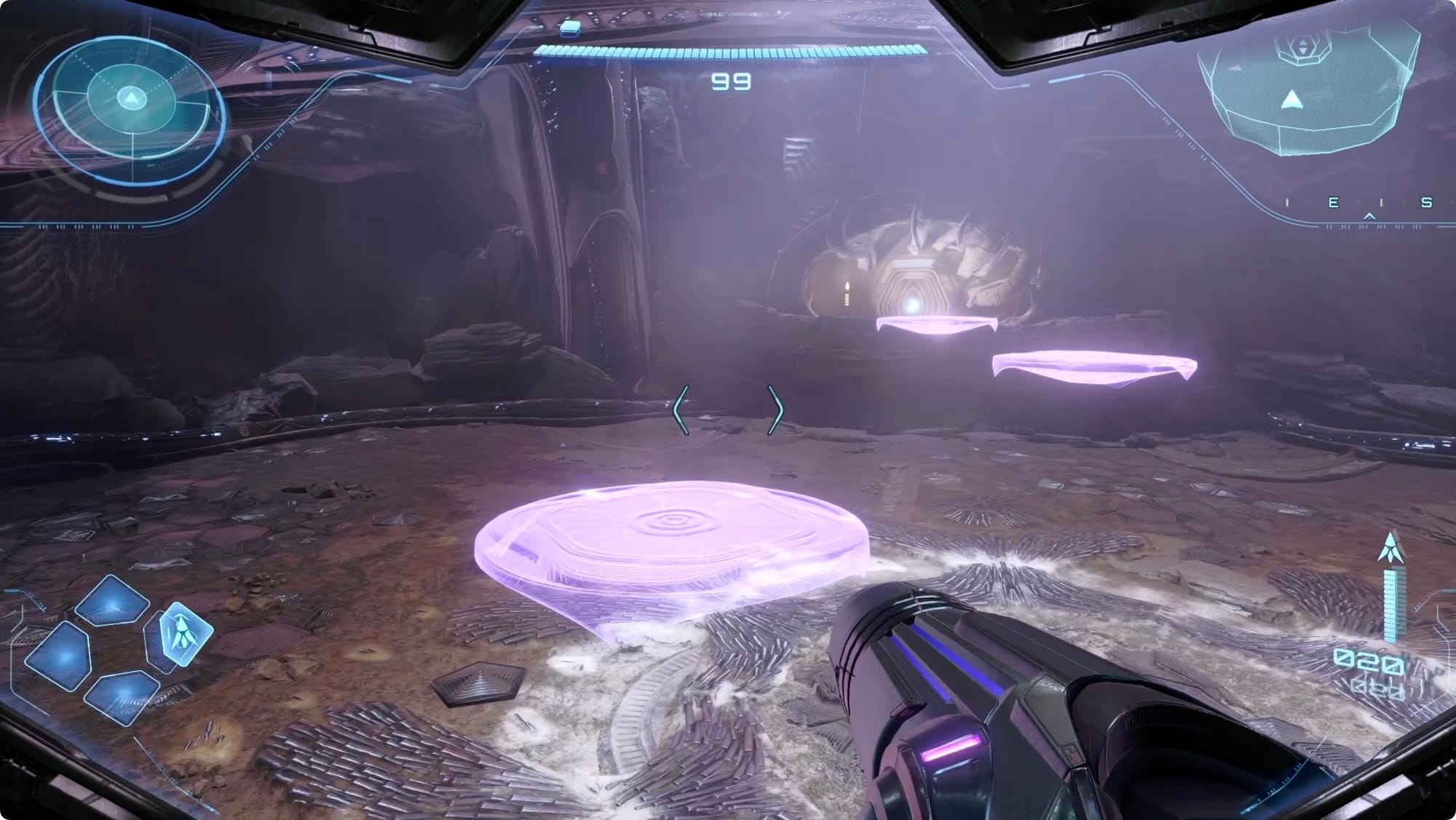 To get out of the arena, you’ll need to use another new ability the boots unlock. Switch to your Psychic Scanner and point at one of the glowing, purple mists. Target it, and a series of Psychic Platforms will appear.