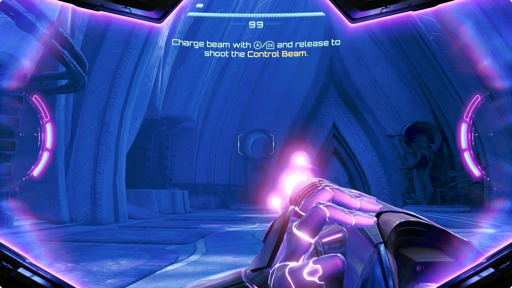 In the next room, stand on the platform to activate three Control Beam targets. Fire a Control Beam and use ZL to lock on to each consecutive target to save yourself some trouble.