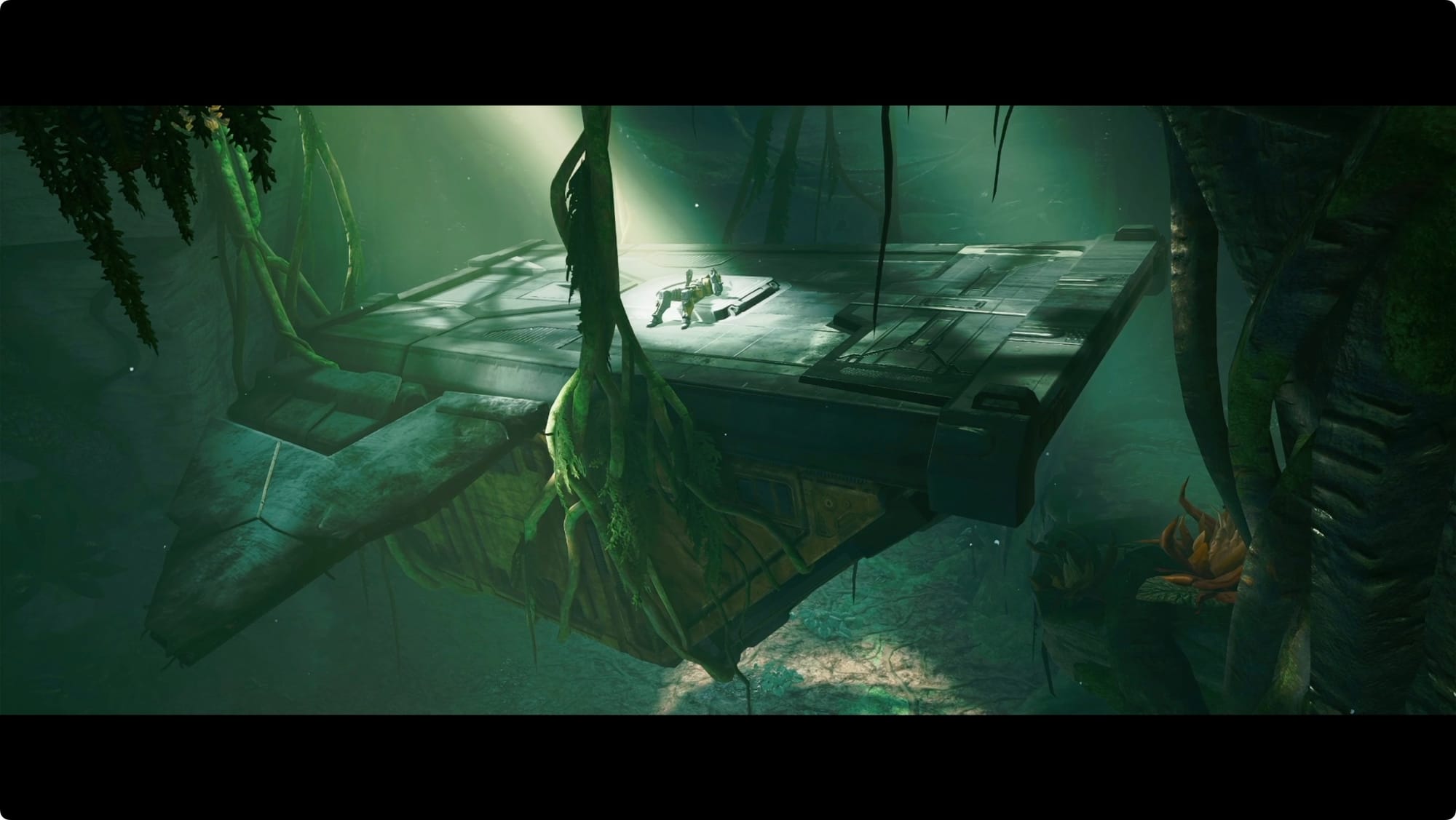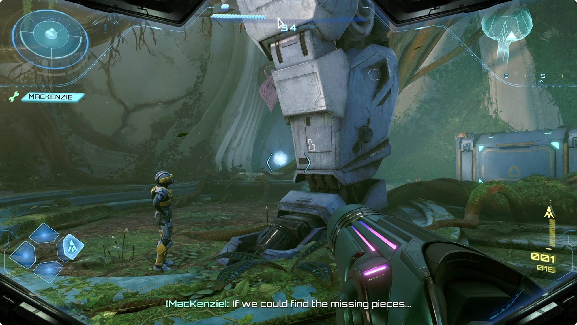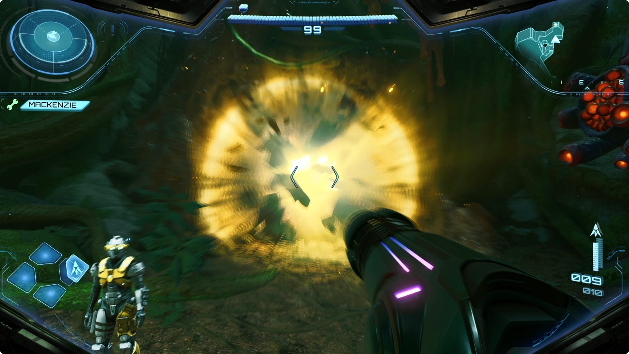Drop off the ledge you come to and keep heading forward until you meet a Galactic Federation Technician — the source of the distress beacon. He’s stuck on top of his transport, but the vines holding it up have explosive growths on them. How convenient.