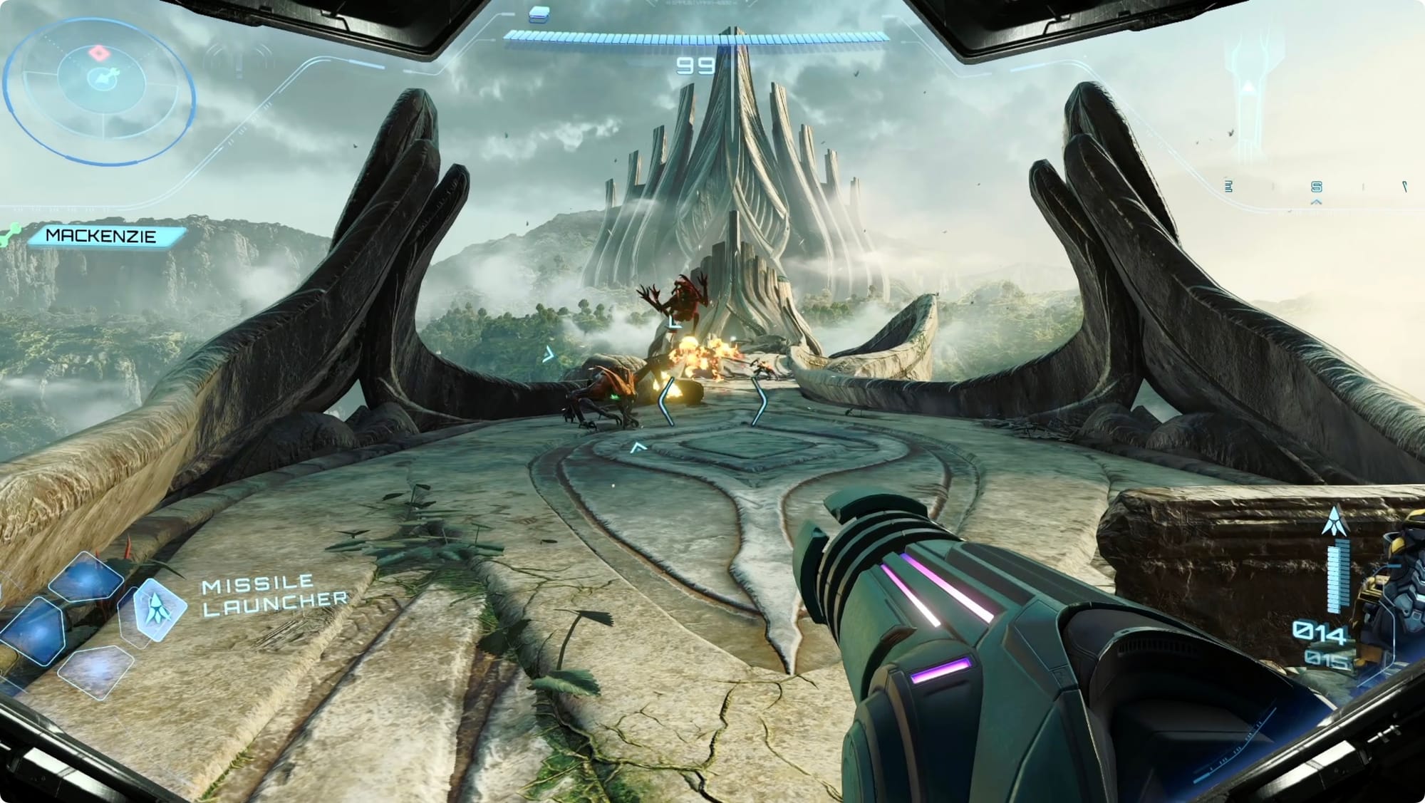 After Myles introduces himself, he’ll tell you he’s got a present inside the transport. Help him open the door by shooting the latch, and then head inside for the Missile Launcher.