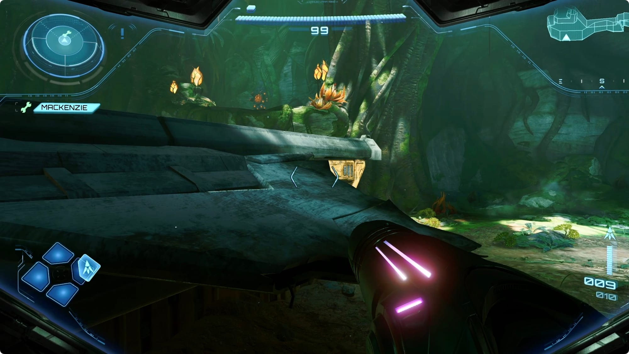 Use the wing of the transport to climb on top, and then hop across to the ledge. Keep following the tunnel out until you reach the Save Station you visited earlier. Save again, and then head back to the room where you first picked up Myles’ beacon.