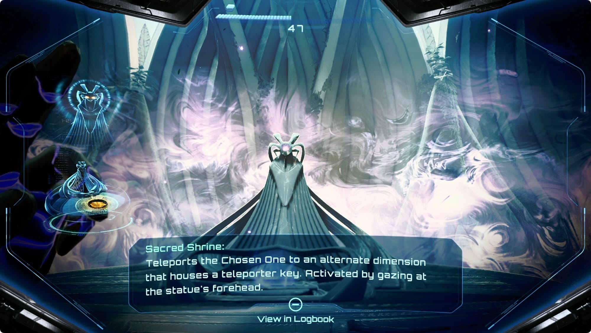 With your new powers, scan everything to make your way back to the round room. In the middle, use the hologram to ride the elevator to the top of the tower. Scan the statue you find there to get a message (and mission) from a Lamorn priest named Chatoyant Vooloon. Chosen One, doomed civilization, new planet, five keys, yadda yadda.
