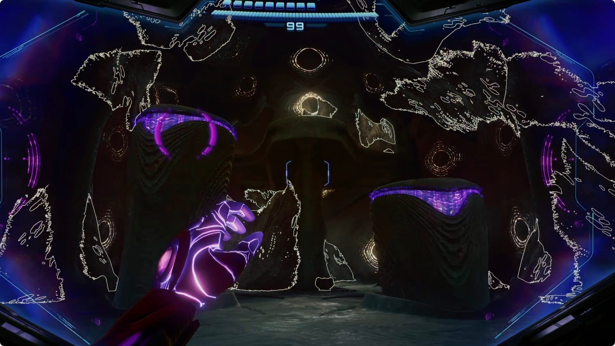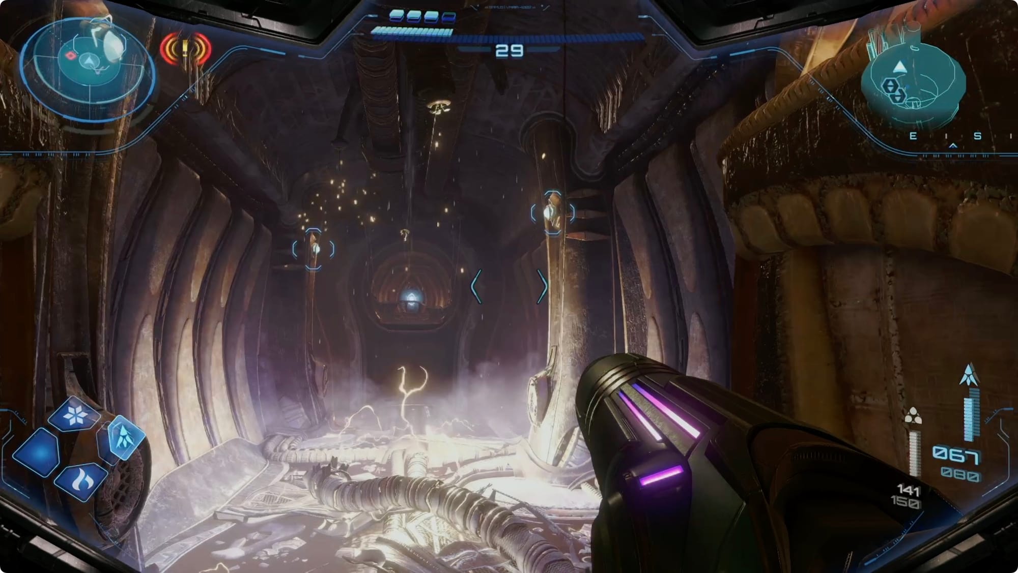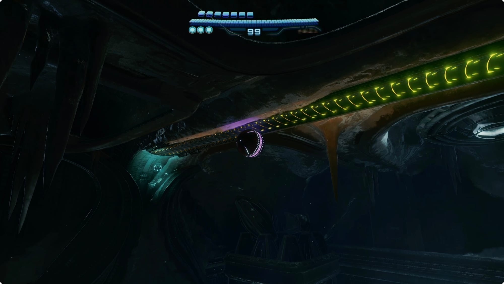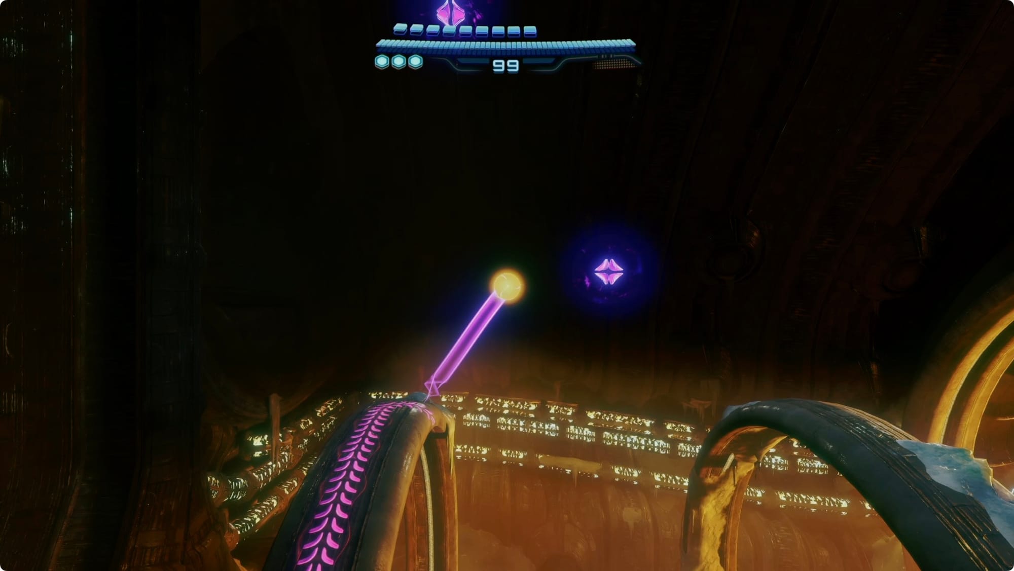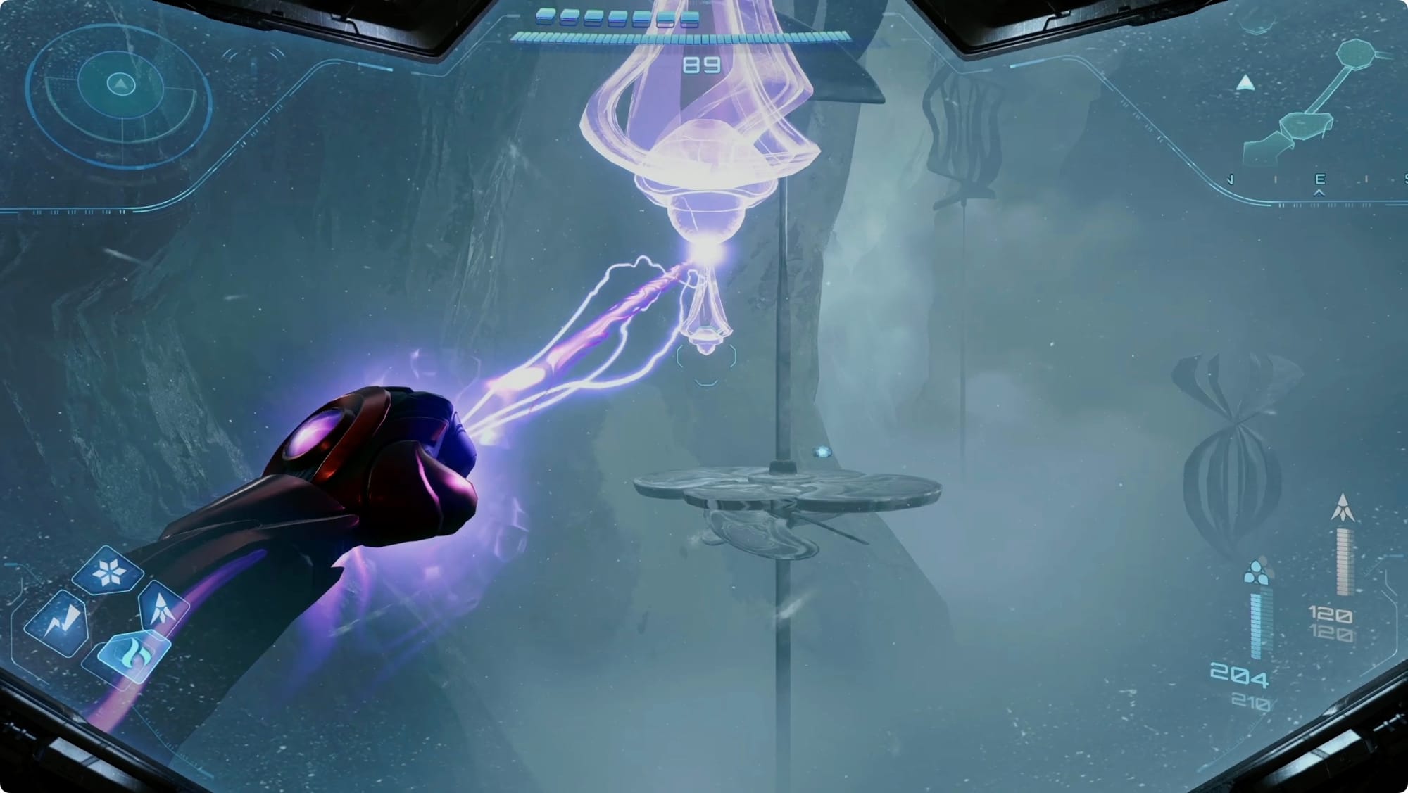 Scan the Psychic tracks that appear to get out of the room. Back at the (broken) lift, scan the purple haze to reveal your path — more Psychic Spider Ball paths and some tethers. Getting out is a bit of an adventure, but there’s only one way to go (spoiler: up).