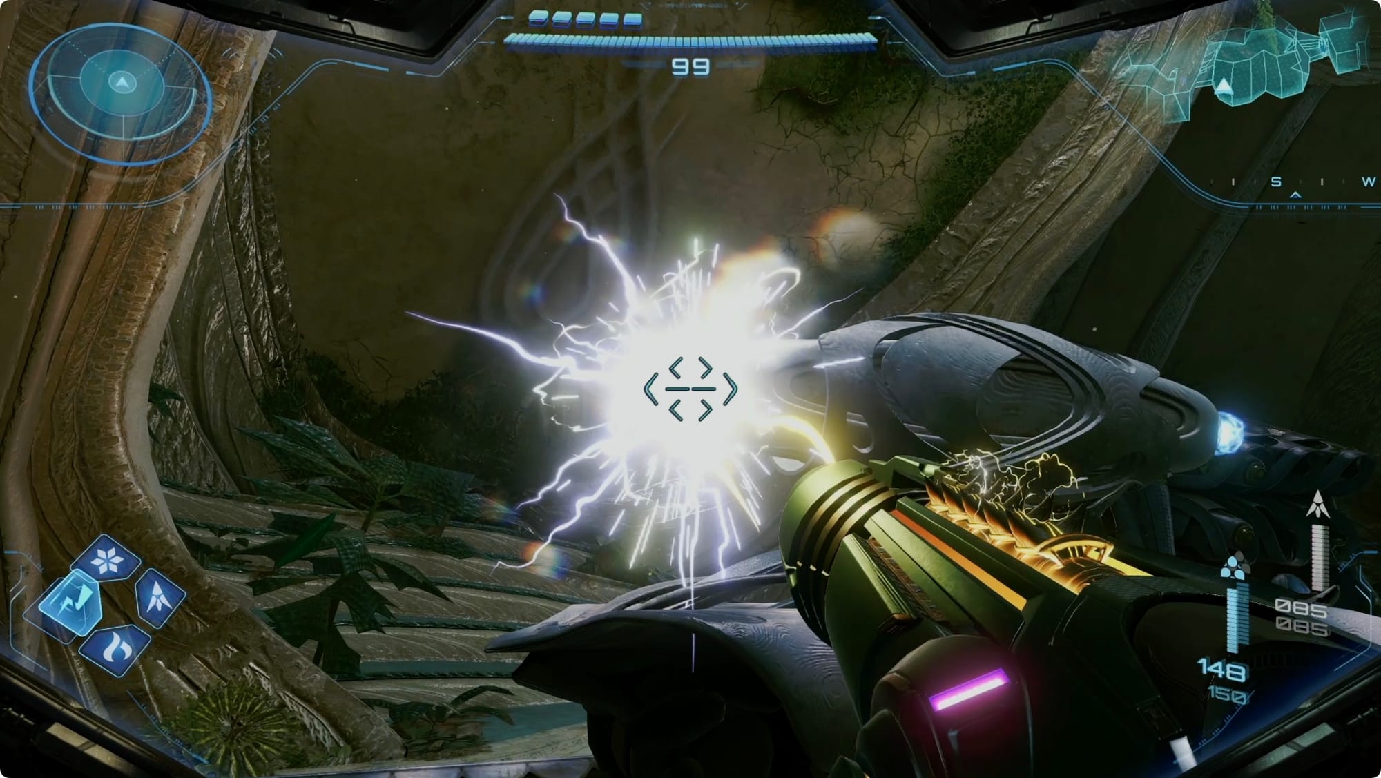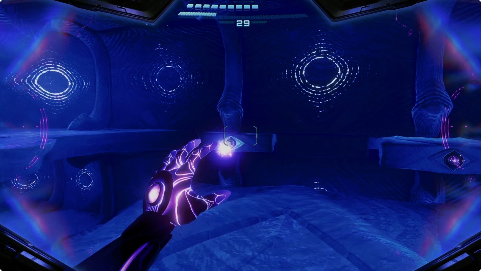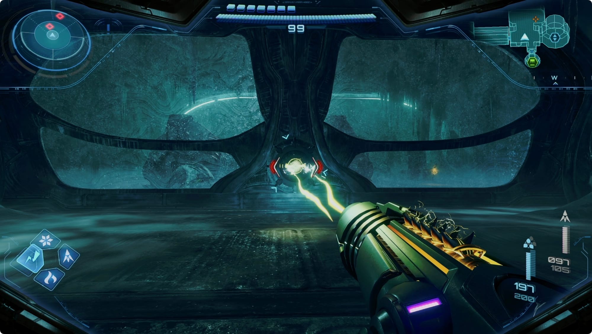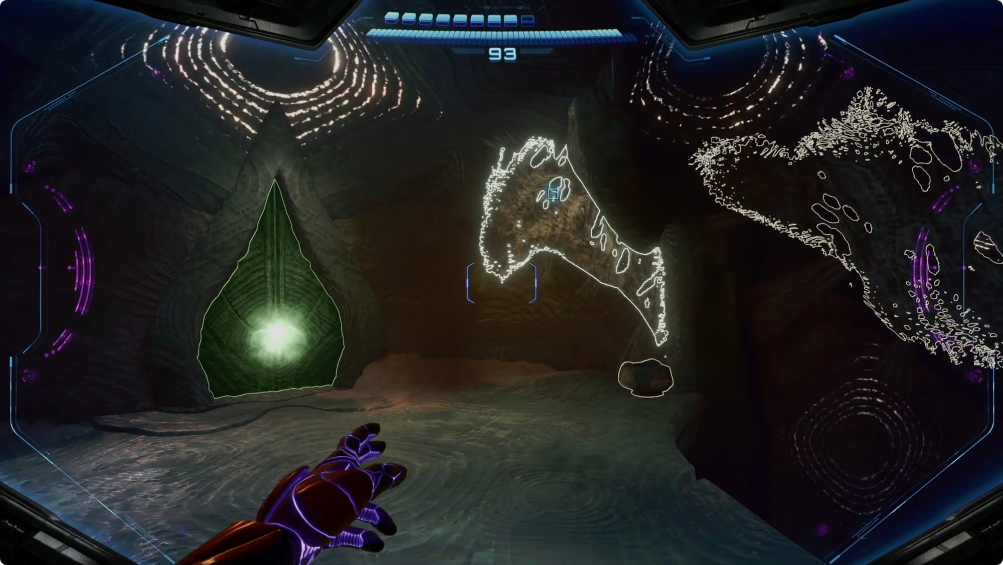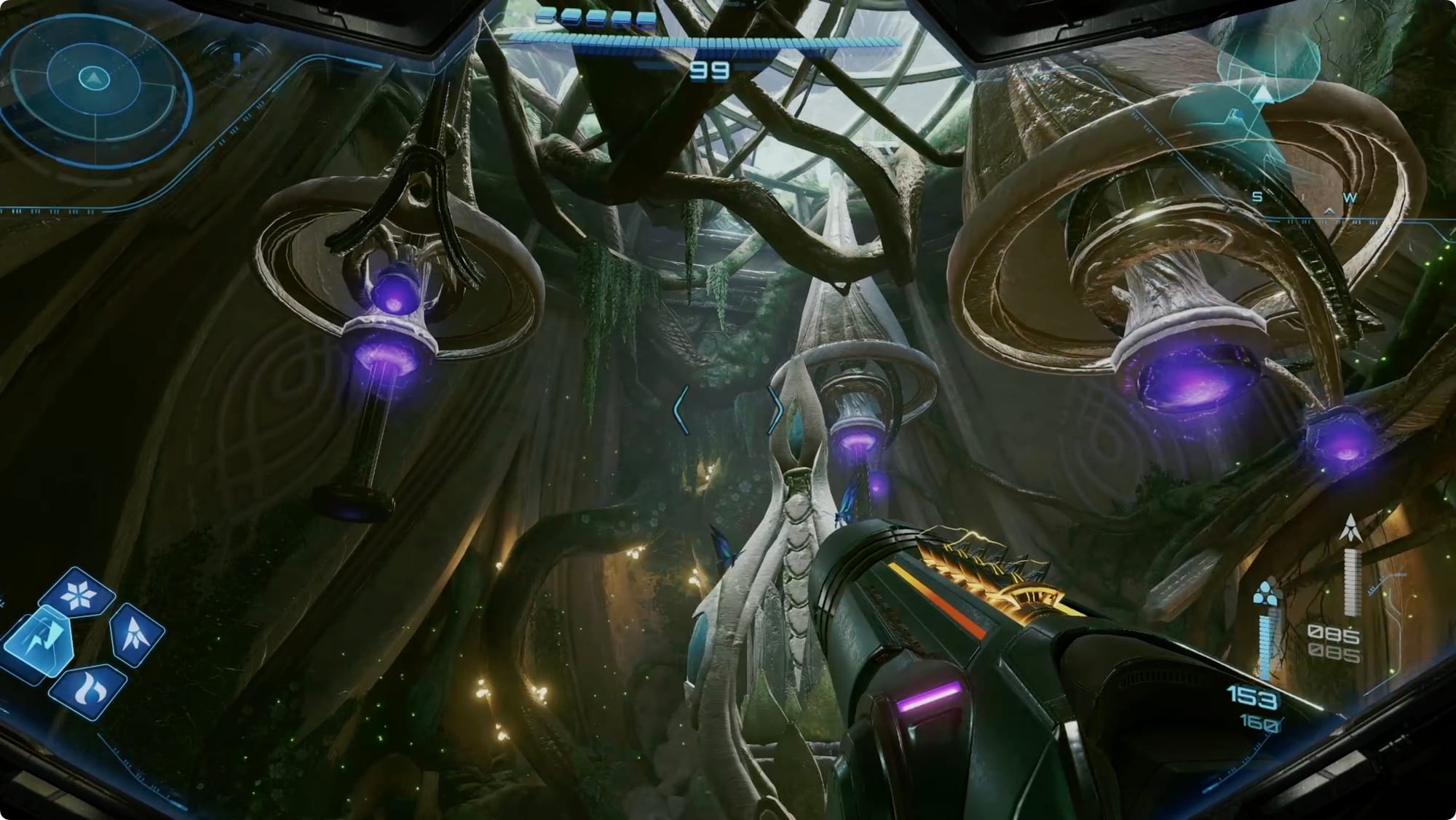 Scan the Psychic tracks that appear to get out of the room. Back at the (broken) lift, scan the purple haze to reveal your path — more Psychic Spider Ball paths and some tethers. Getting out is a bit of an adventure, but there’s only one way to go (spoiler: up).