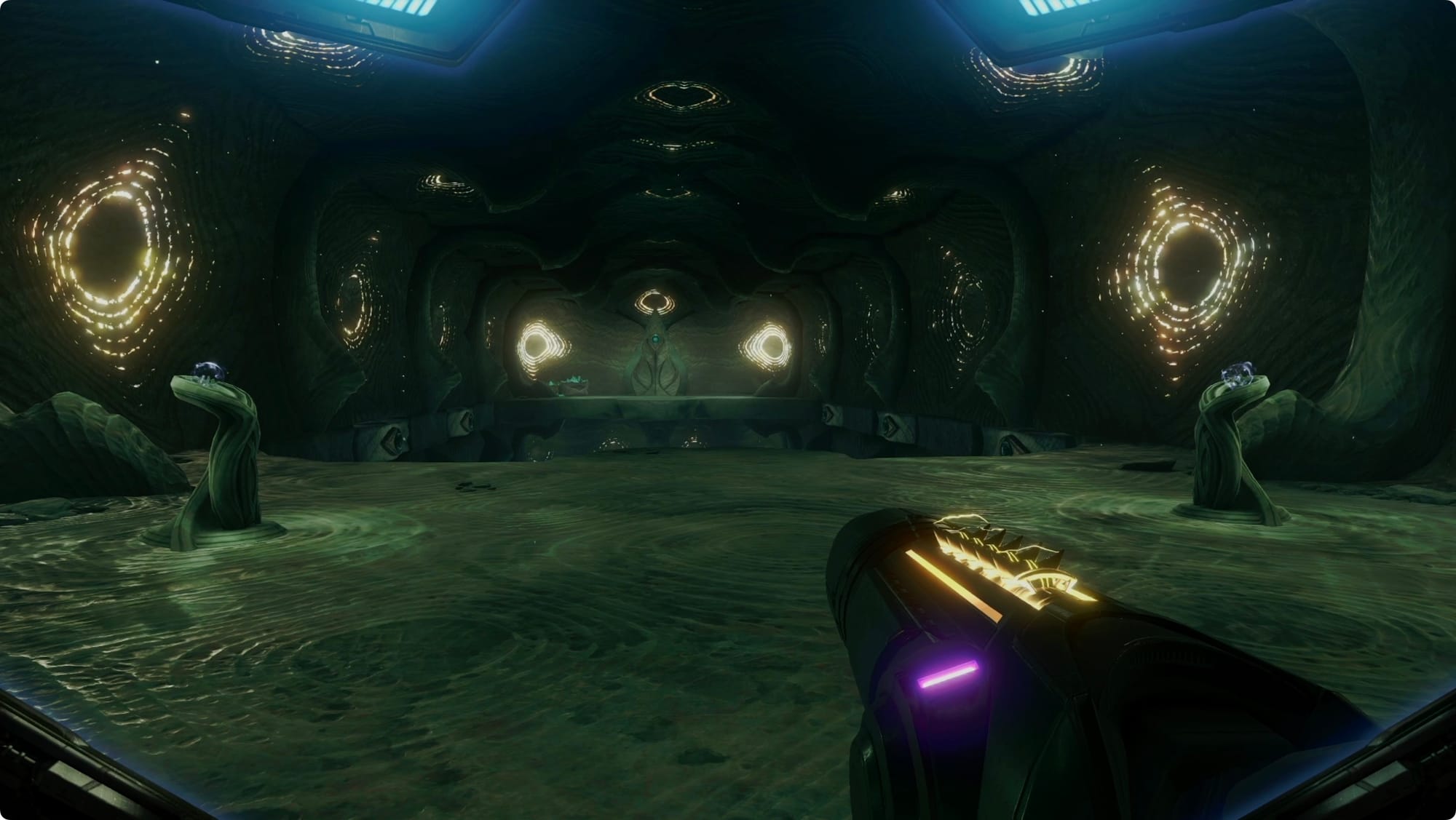 Take the Cargo Launcher back to the start of Fury Green. When you land, take one of the doors to the north and south to head down and get back to where you started your adventure — just with more Grievers this time.