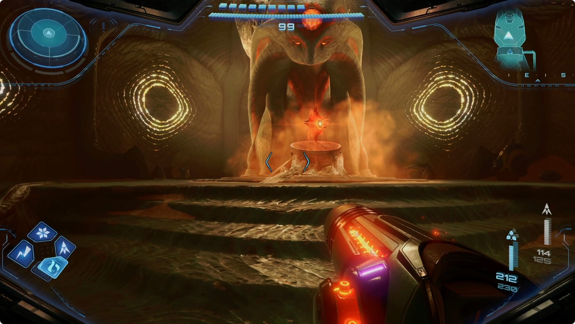 Inside, roll into the tunnel. At the other end, scan the Lamorn statue for some exposition. Behind the statue, Fire Shot all of the ice blocking the shaft down, and then hop to the bottom.