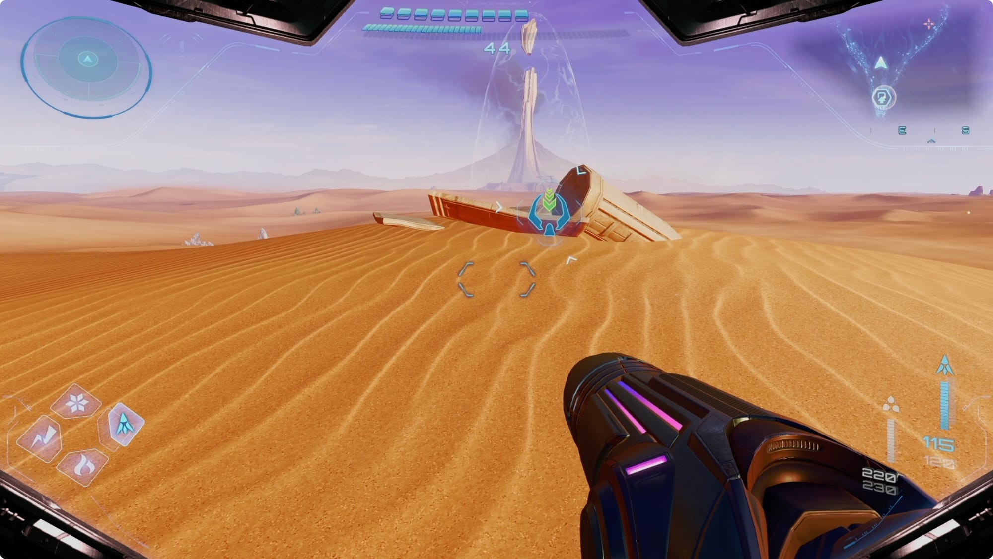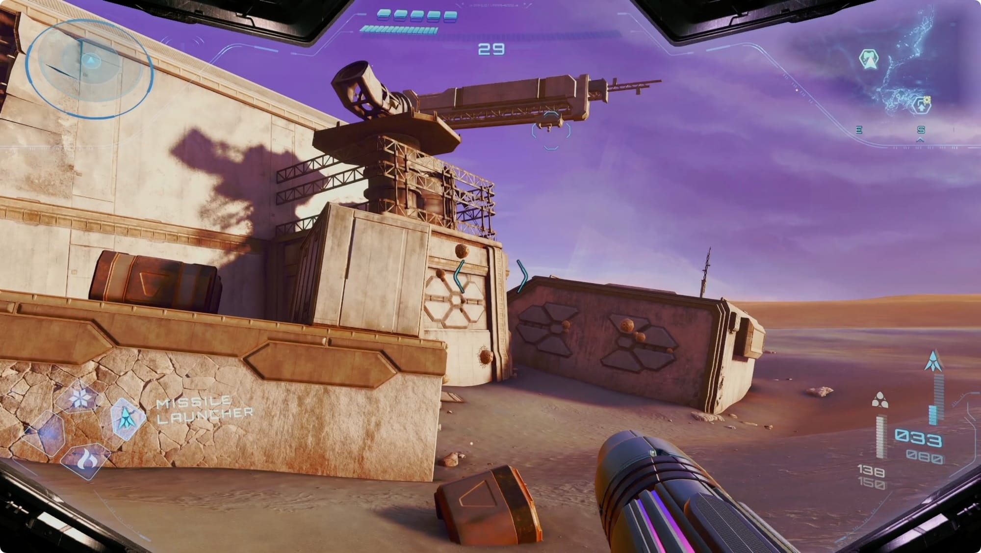 As you leave, point straight out of the gates heading southeast. At the top of the first dune you come to, there’s some debris. Lasso it for a crate with a Missile Expansion inside.