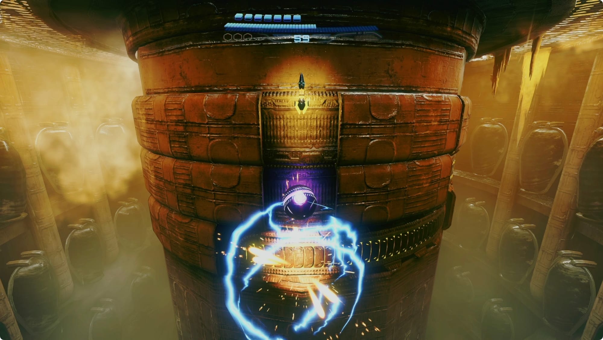For this one, use your Psychic Glove to pull all three of the conductor rods to their lowest point (with the central … grab point?) and then point them at the sculpture in the middle of the room (with the … not central grab point — look. I’ve written a lot for these and I’m running out of words). Hit them with some Thunder Shot to power up the device and claim your Shot Expansion.
