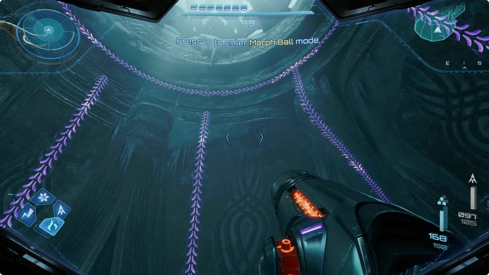 Continue through to the Storage Bay. This time, hop the railing and loop around the base of the room until you’re on the east side. Morph Ball into the socket there.
