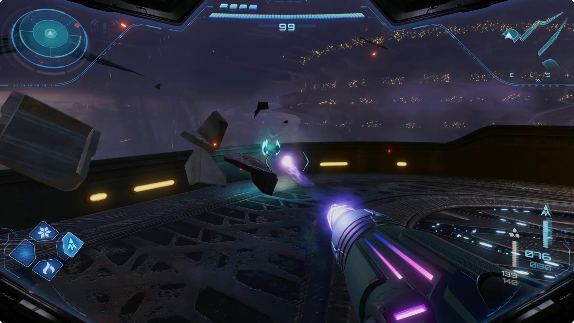 You’ll see some smoke on the horizon. When you arrive, you’ll find some Galactic Federation wreckage. On the north side, there’s two steps to claiming your reward: fire a Control Beam into the base of the crane(?), and then grapple it to swing across. You’ll get a Missile Expansion on the far side.
