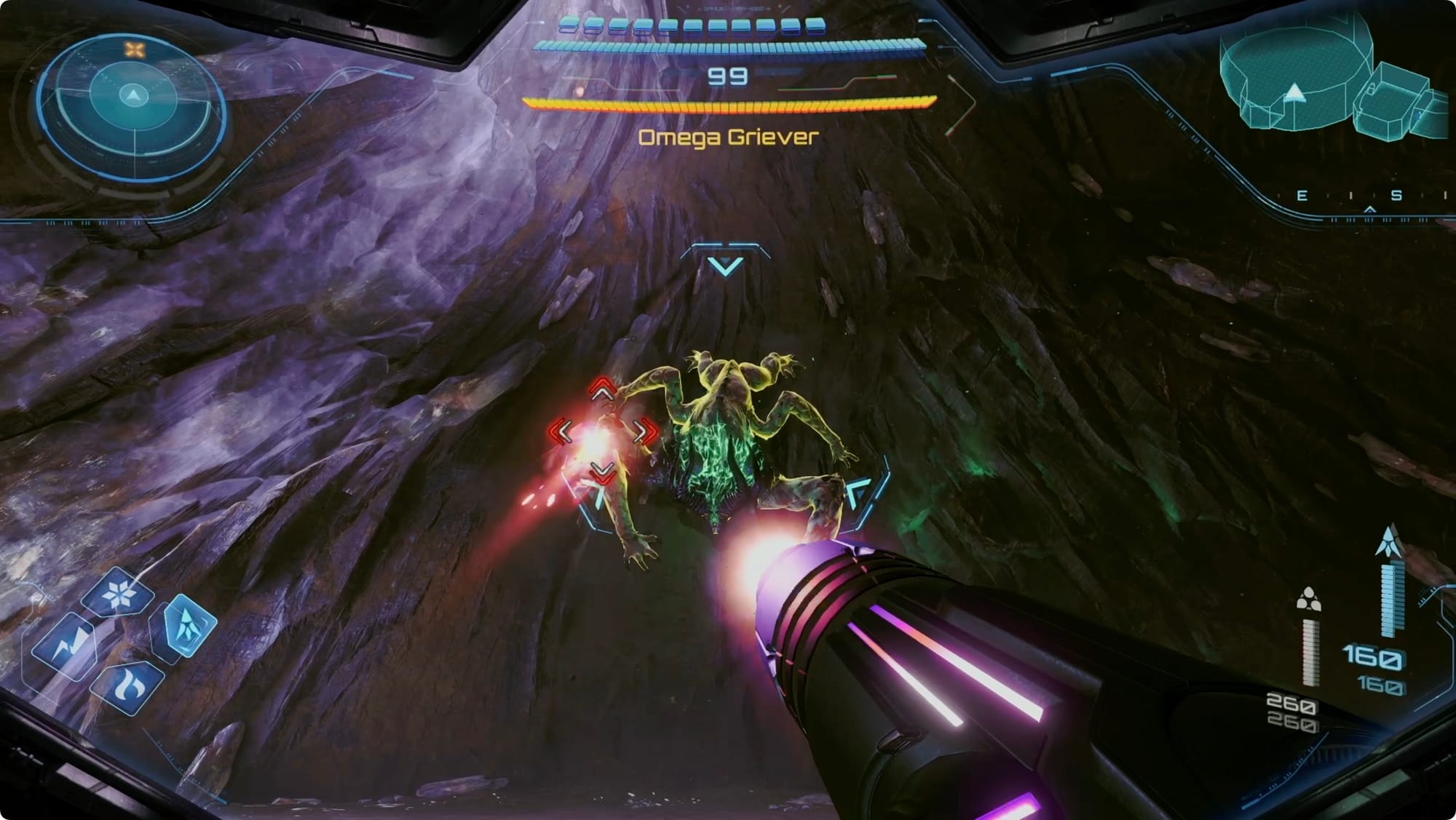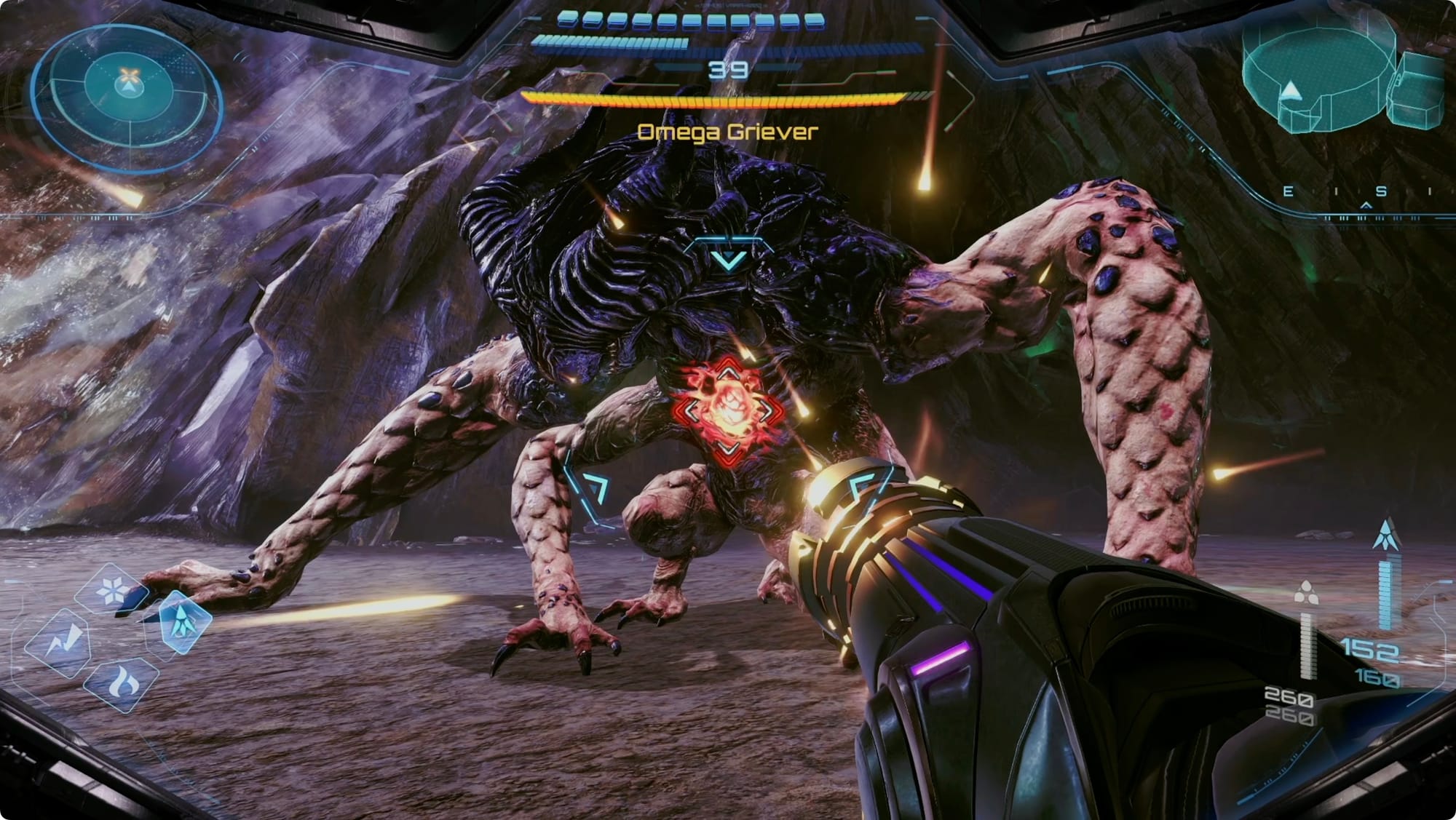 It’ll start off the fight on the walls. Keep the Omega Griever targeted so you can dodge its spit attacks. While it’s running around, target the hands and feet with whatever you can throw at it. For this, stay locked on and use the right thumbstick to move your target to the side.