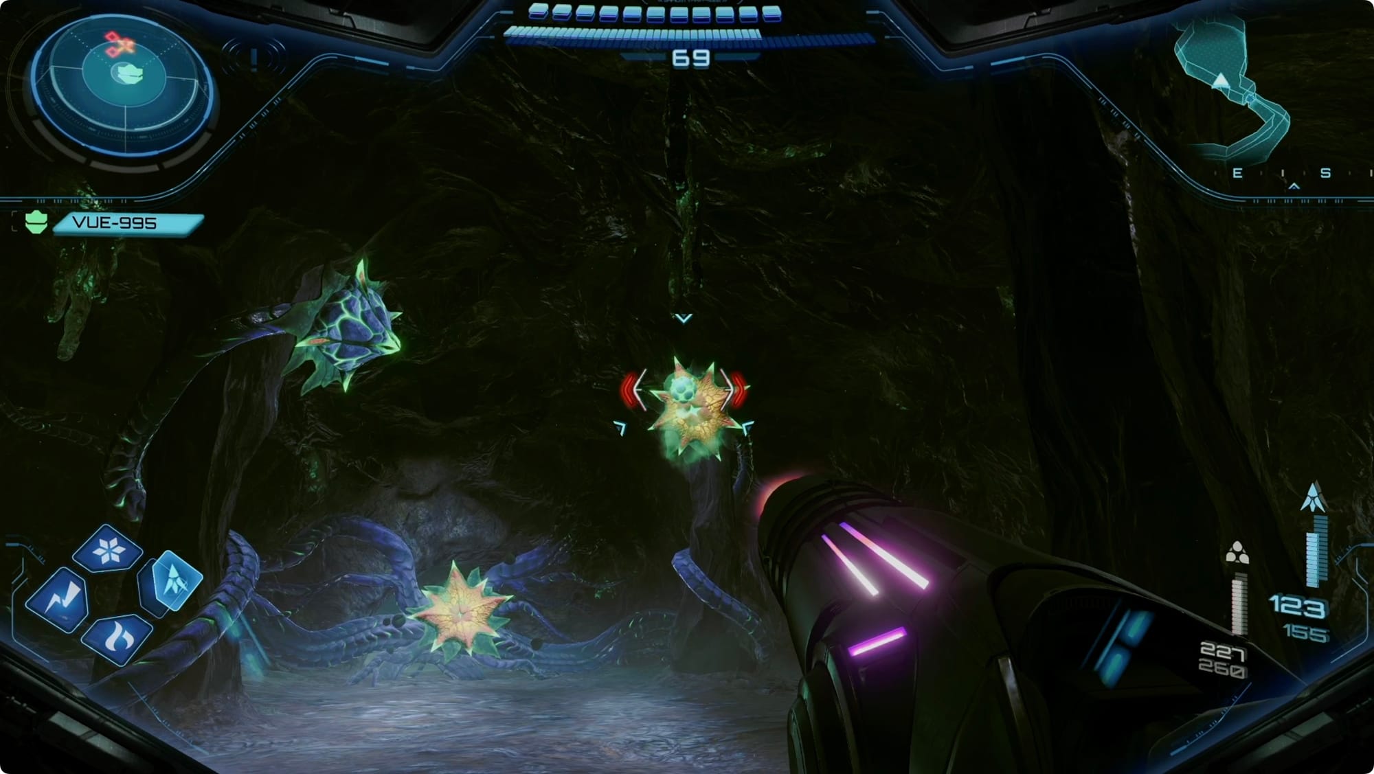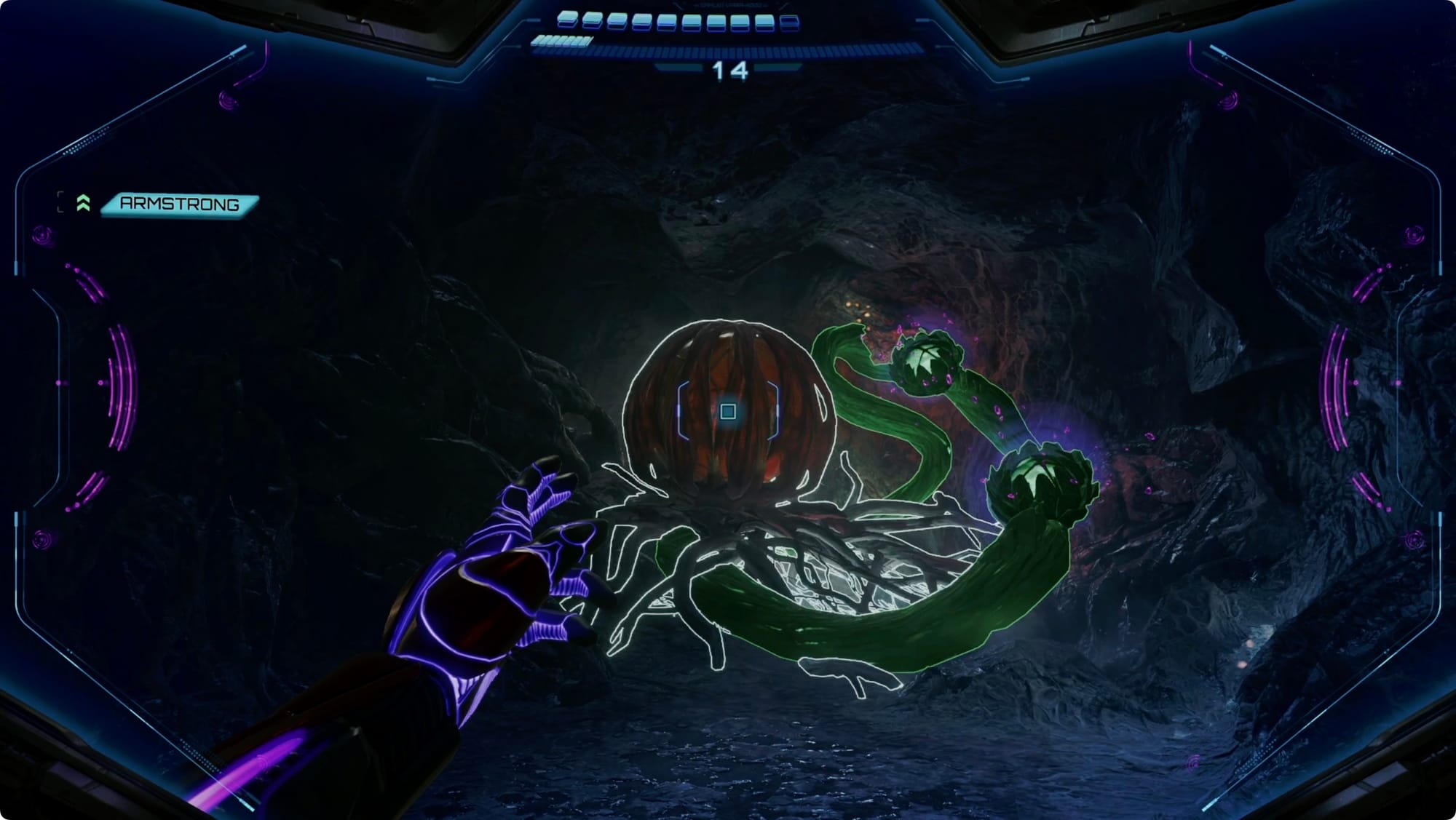 Clear the Ghaspores in Ghaspore Habitat B the same way, and continue forward until you hit the Main Nest. Scan around and then ask VUE to smash the membrane at the back of the room.
