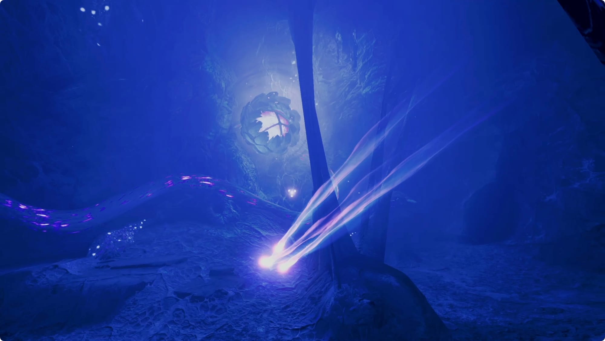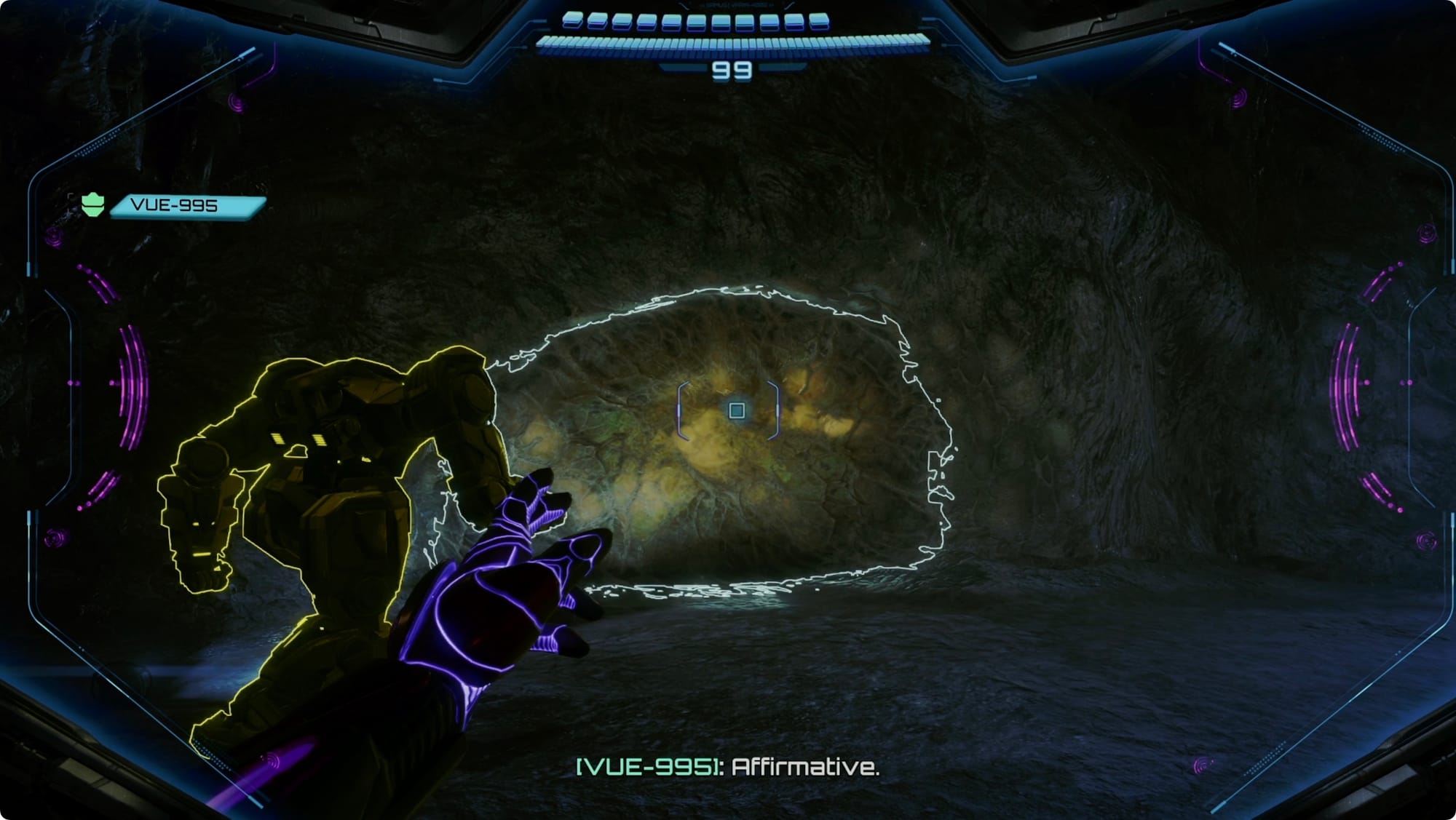 Scan the membrane blocking your way and VUE will destroy it. Follow the tunnel and drop through the hole.