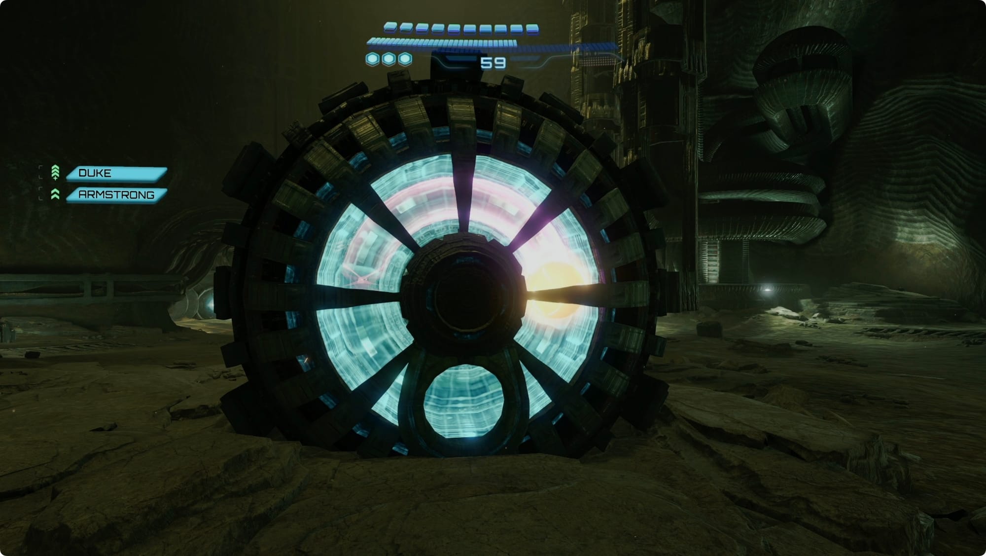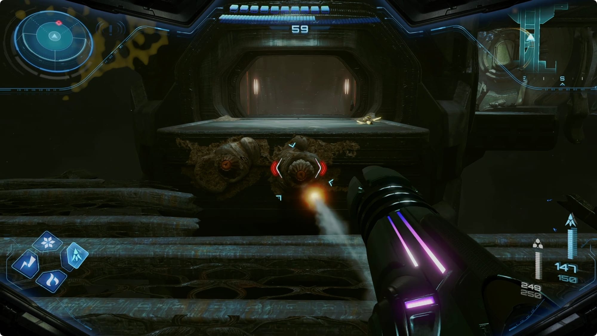 When the Goura Ghaspore membrane in the Hive Entry shoots out spores, shoot the hell out of one to blow up the blockage (gross). The next hall has more corpses to not think about.