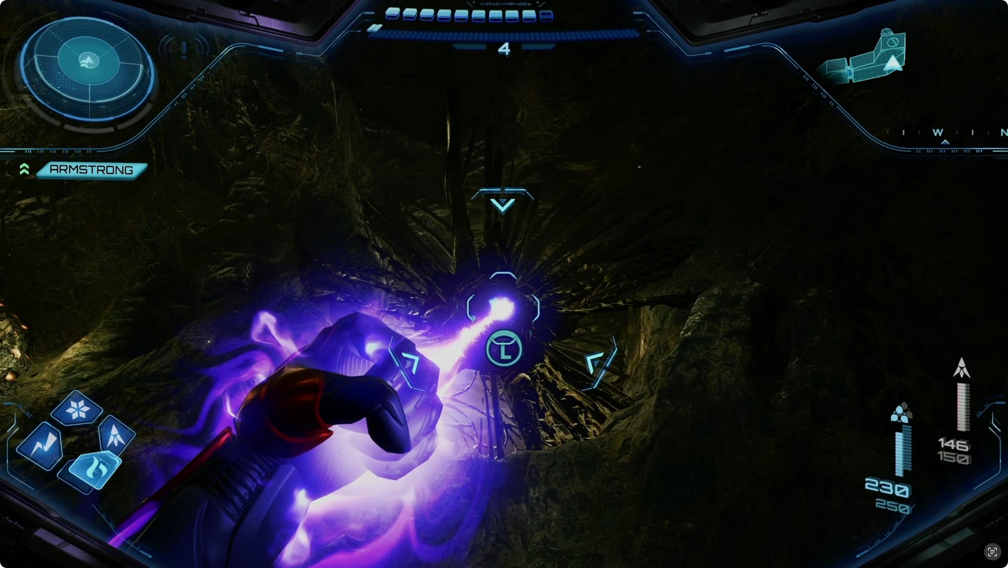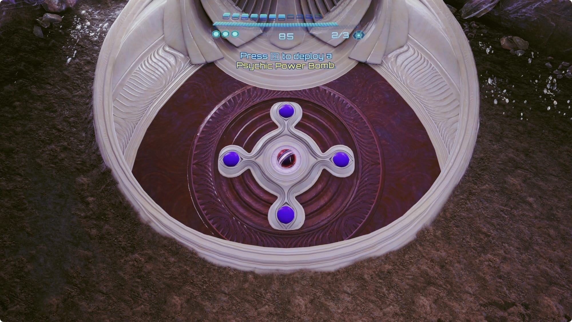 Drop to the floor and Super Missile the Enhanced Lock on the wall to your right. This will expose another lock. Morph Ball and then hold R to float a Power Bomb. Switch to the Psychic Scanner, grab it, and toss it into the lock.