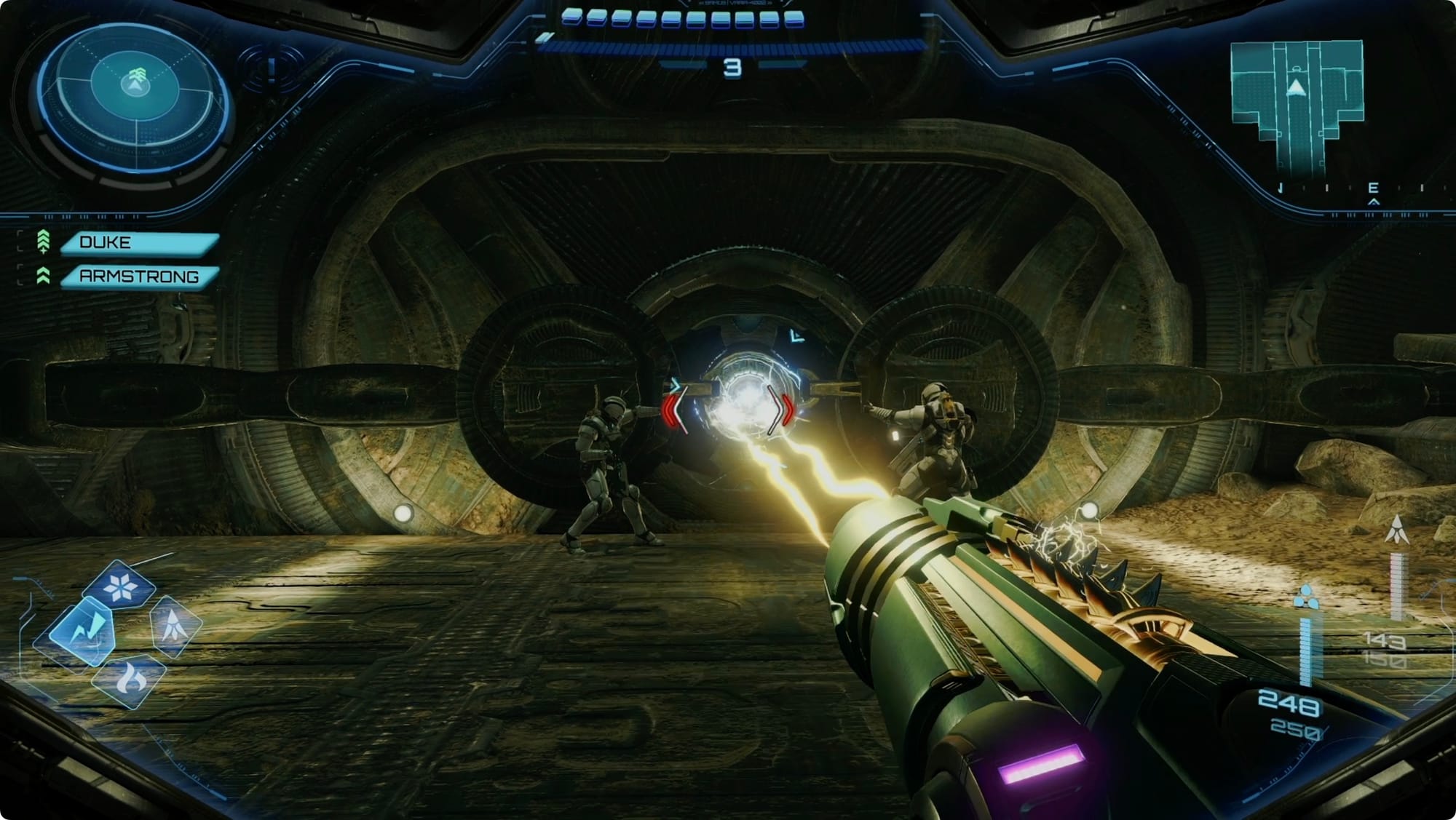 Back in the Command Center, Bomb Slot the security shutter and take a left. Scan the Energy Lock to get Armstrong and Duke to help you out. Thunder Shot the door. In Transit Tunnel A, ignore impossible-to-open (“impossible”) gate on the right, and continue through.
