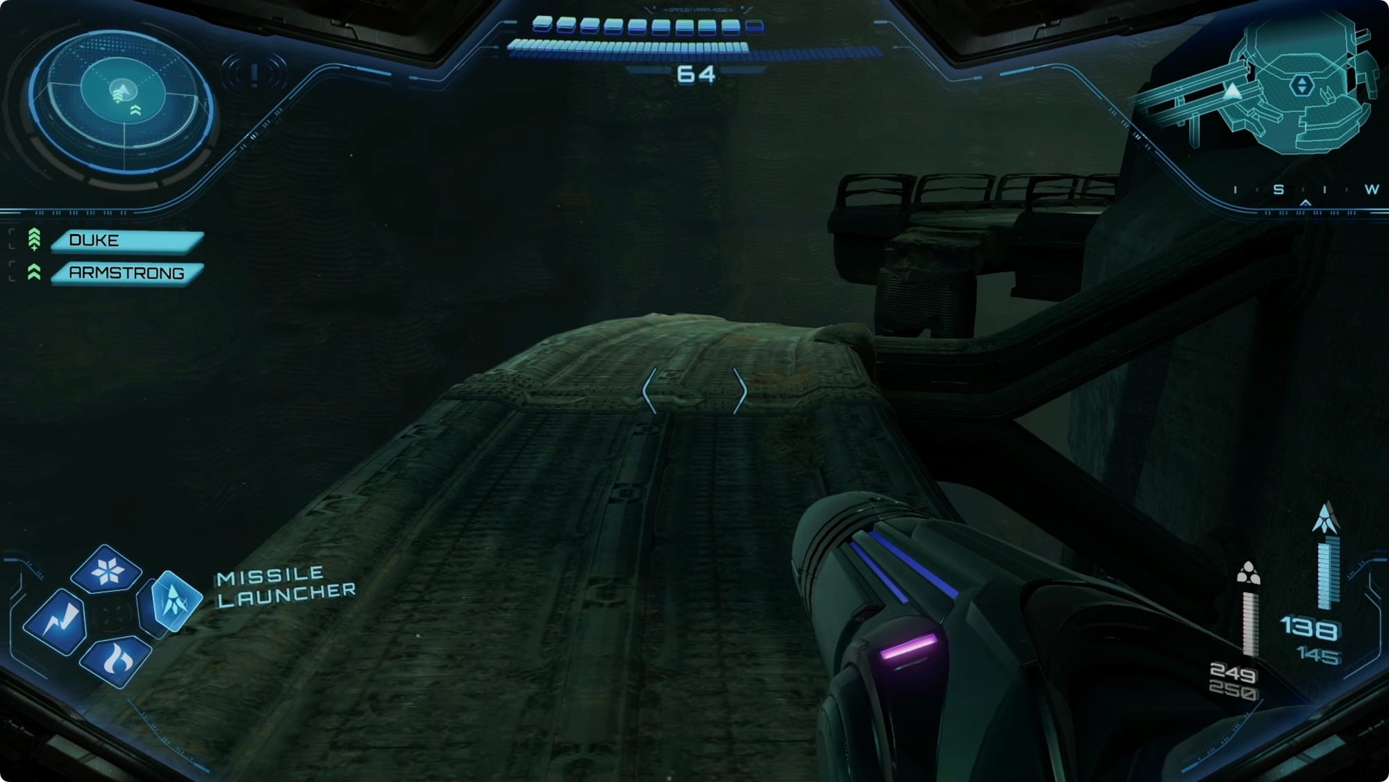 This time, take the Magnetic Rail down. Continue counterclockwise to the east side. Magnetic Rail up and drop off to pick up a Missile Expansion.
