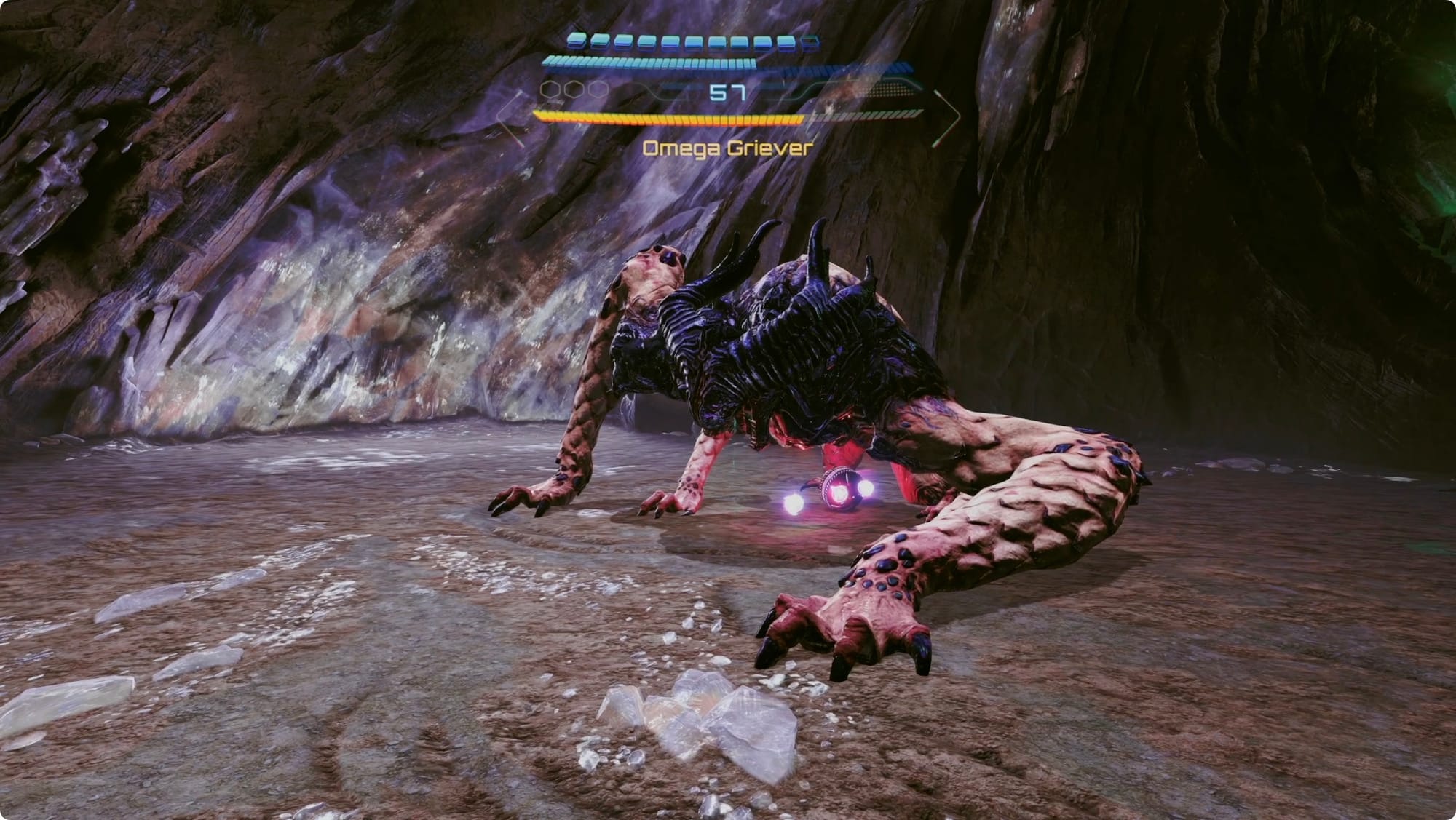 The next section is just a few rounds of running down a tunnel, scanning a membrane, and then Ice Shotting the Grievers chasing you. You’ll eventually come to a chasm where you have a bit of a last stand.