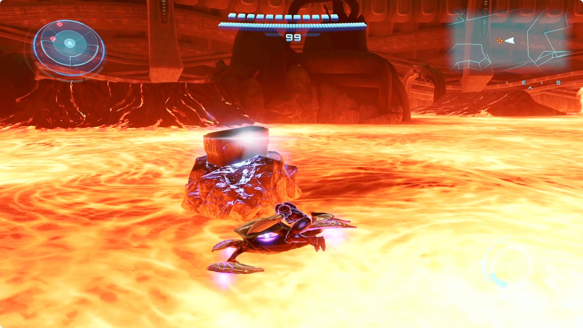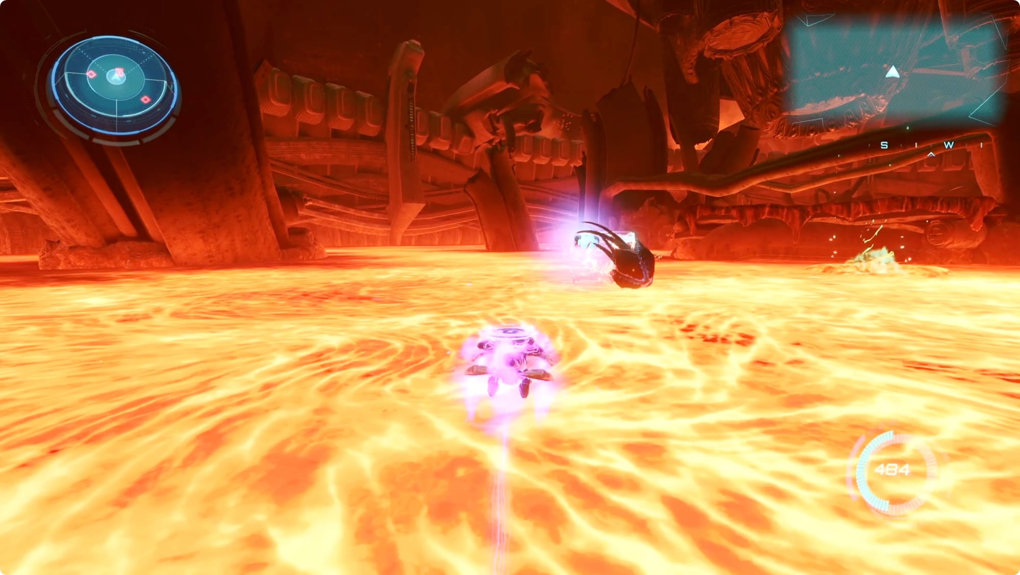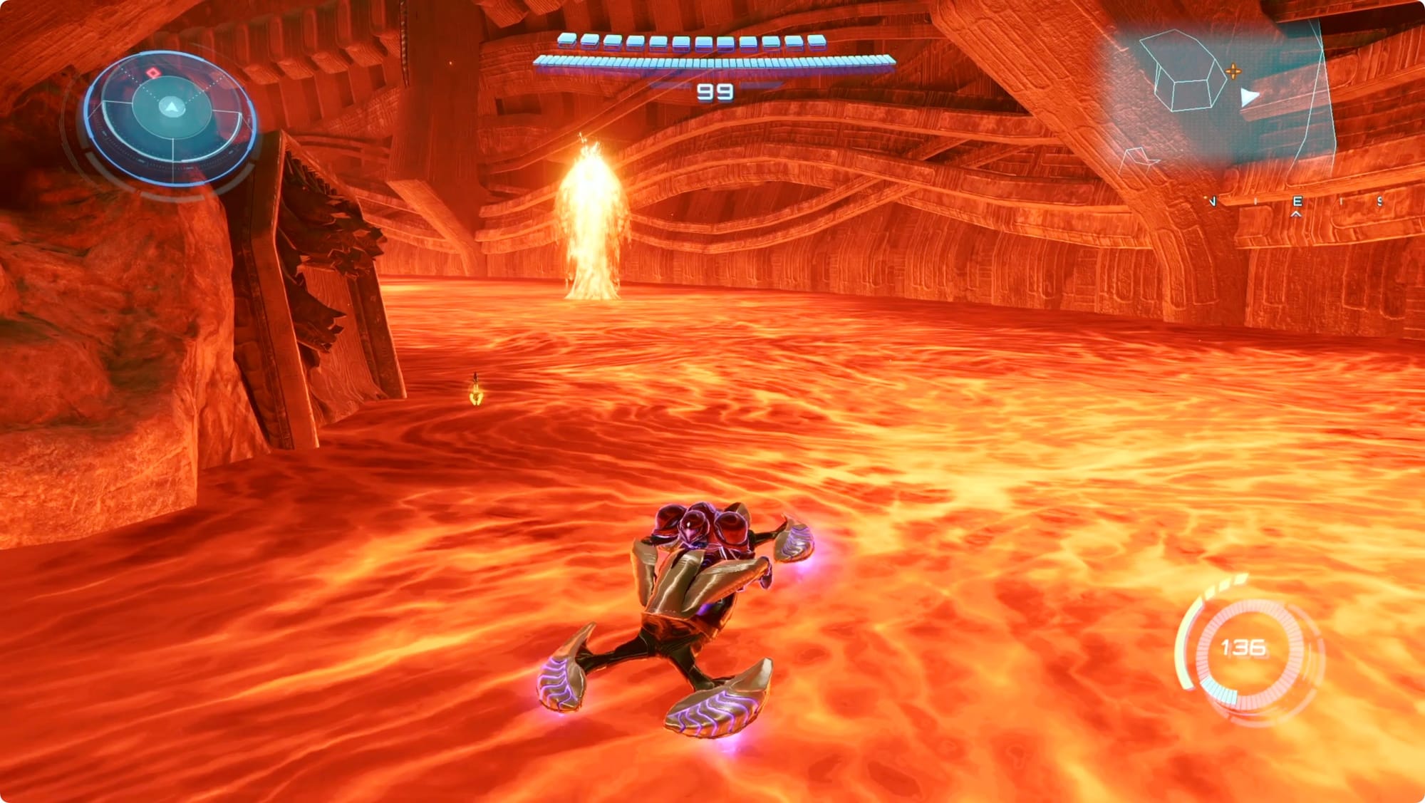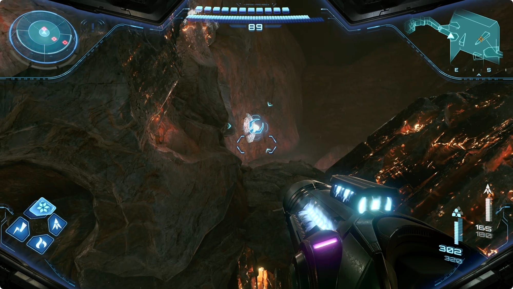 When you exit, turn back toward the room you just crossed and look for the grapple point. Use them to work all the way back across the room where you’ll find a Spinner. Spin it up to turn off the lava flow.