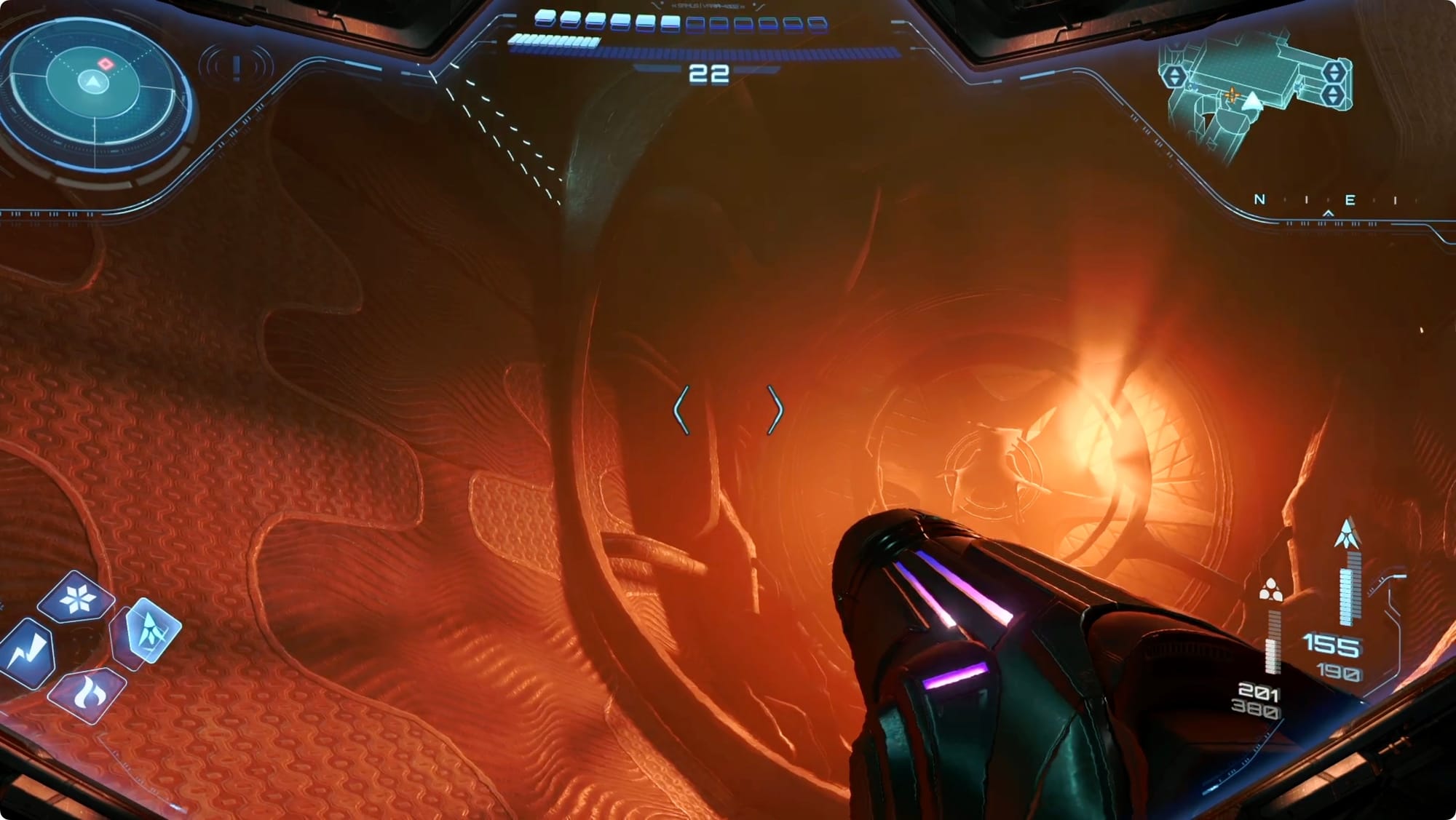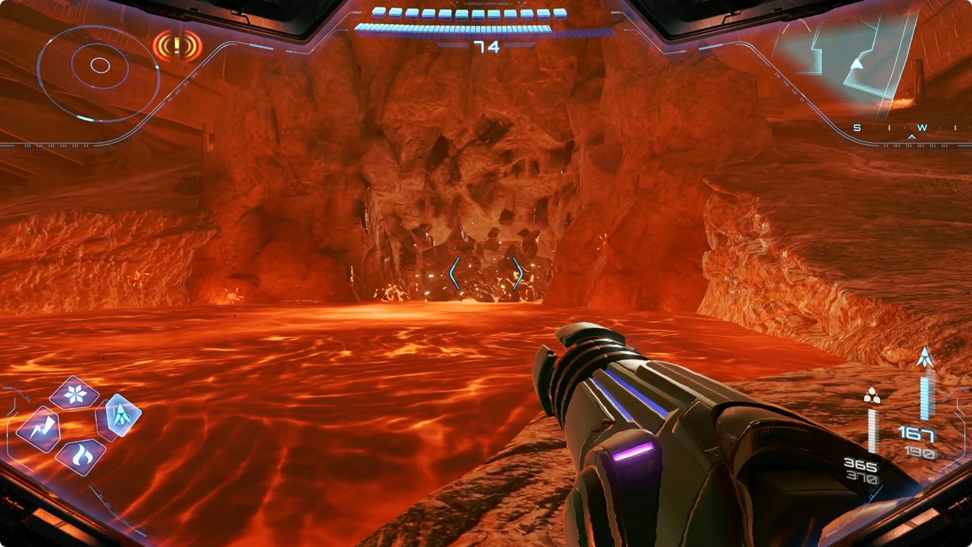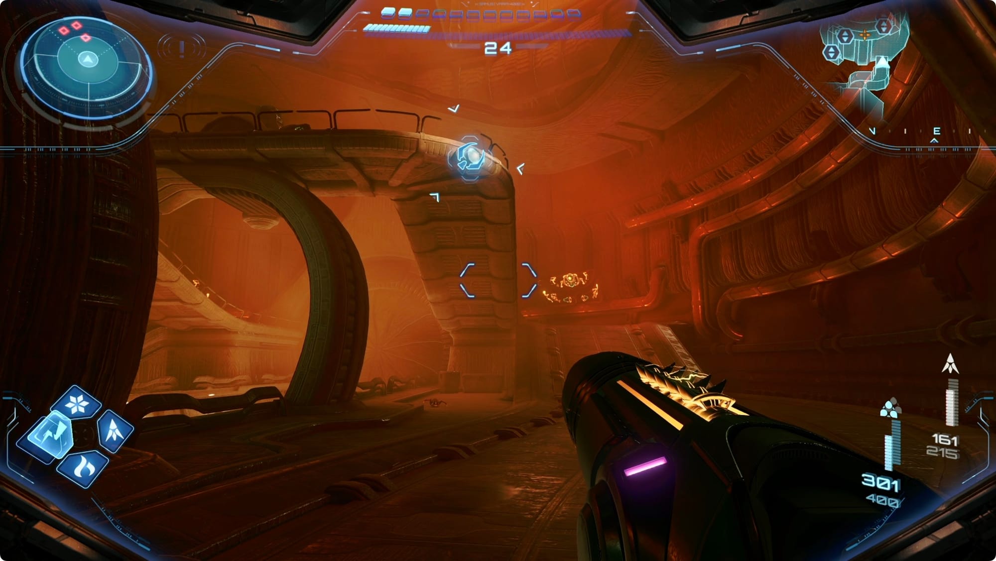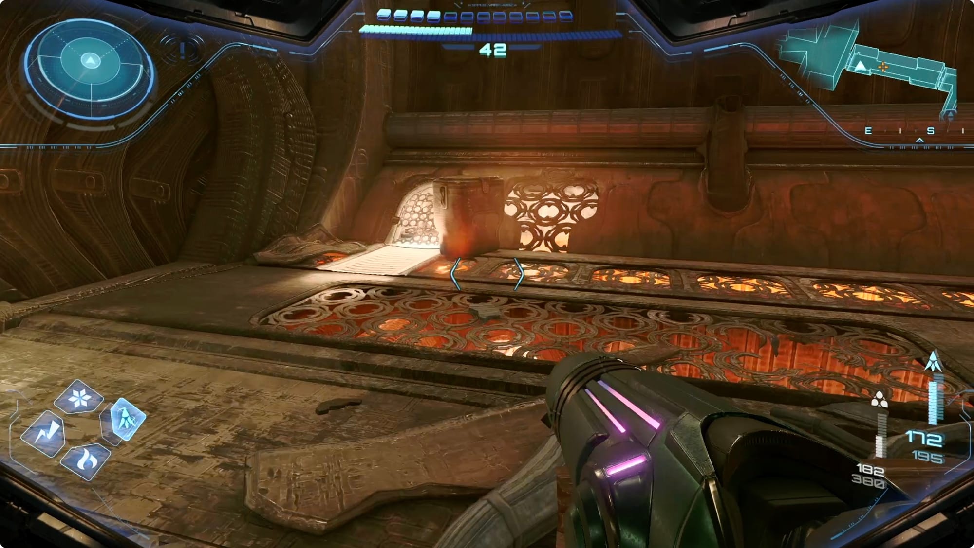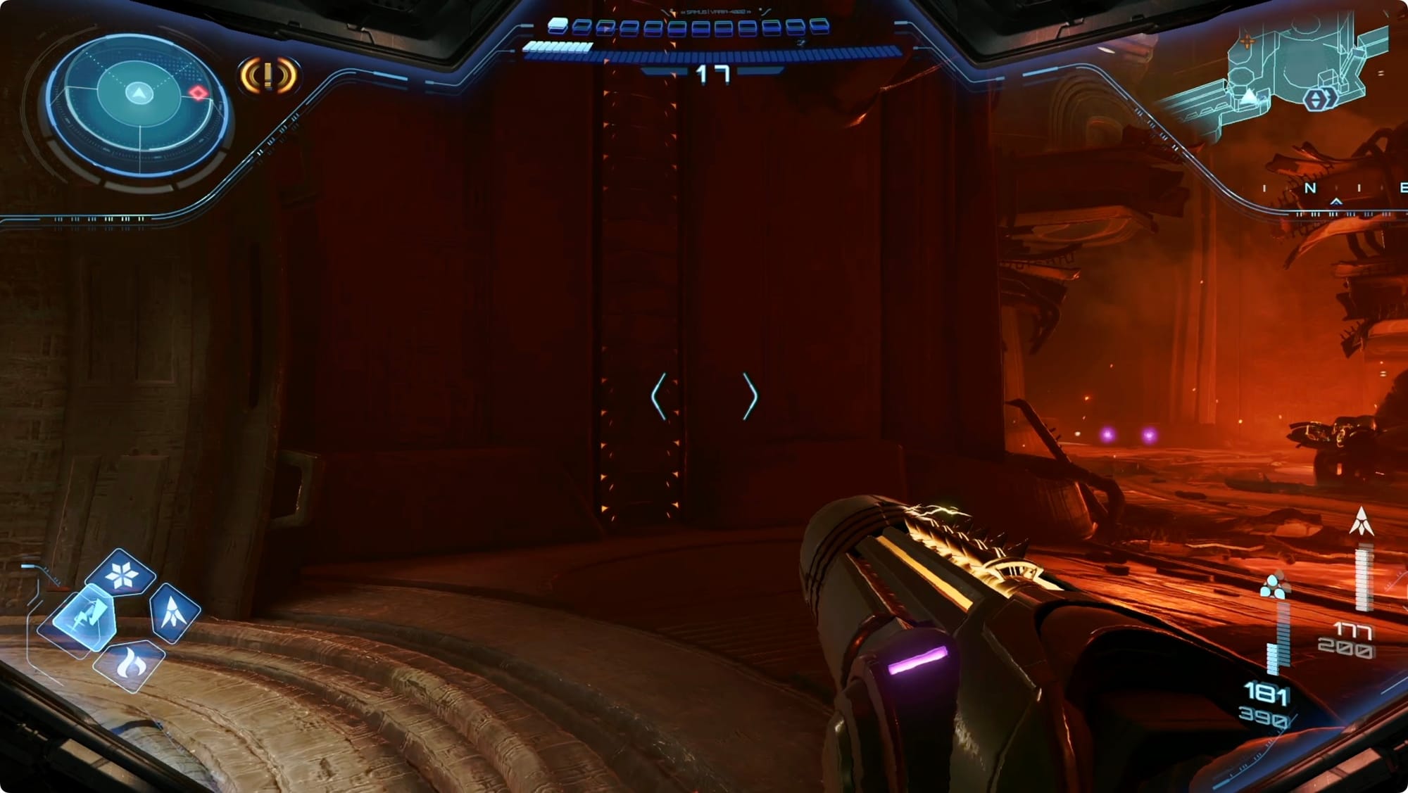 When you exit, turn back toward the room you just crossed and look for the grapple point. Use them to work all the way back across the room where you’ll find a Spinner. Spin it up to turn off the lava flow.