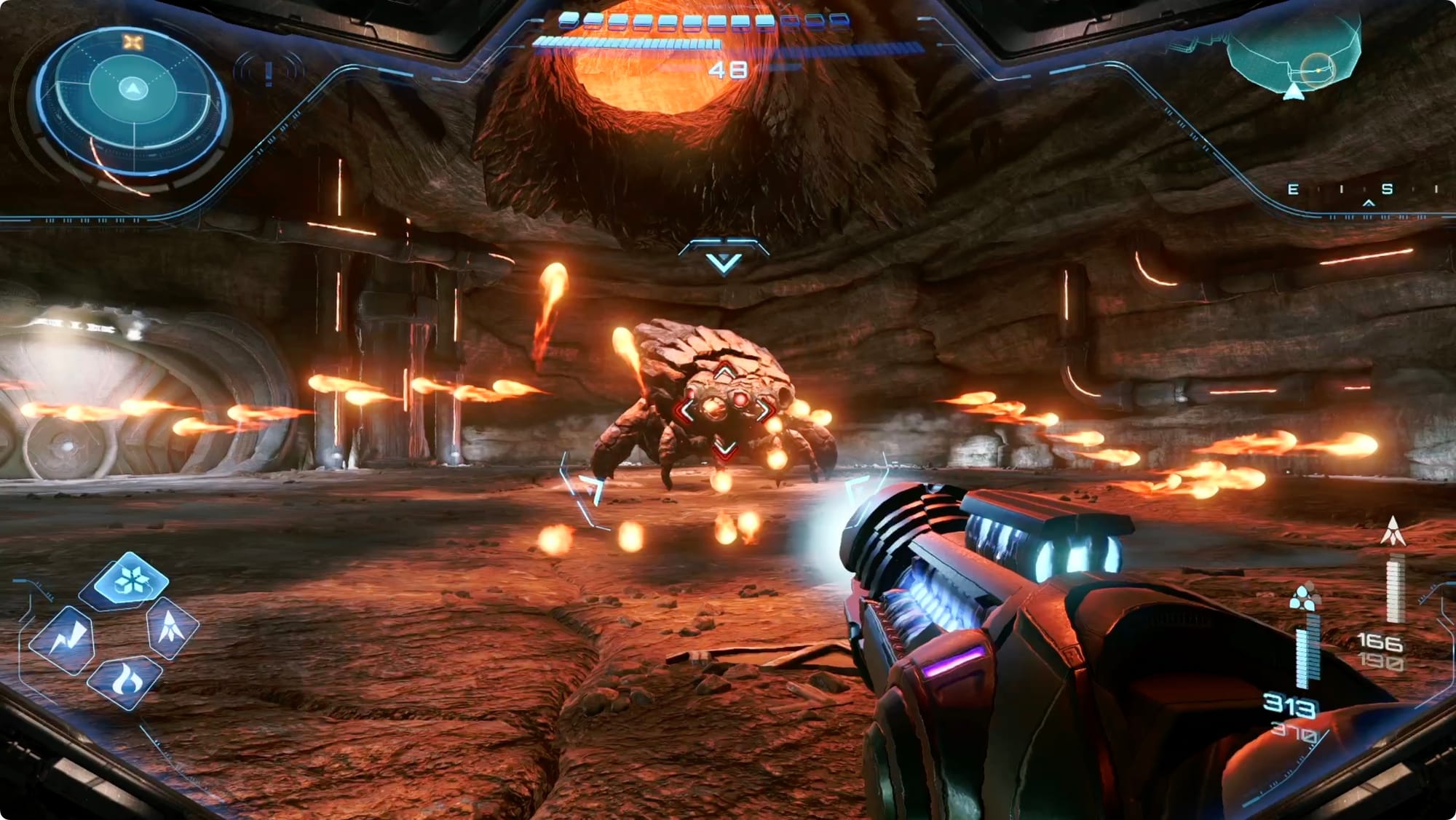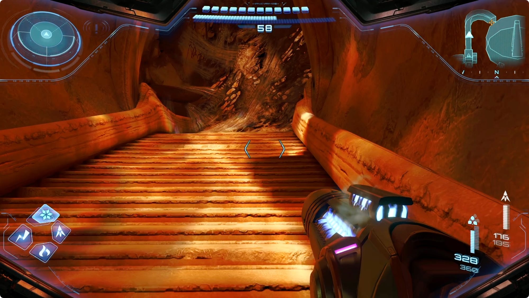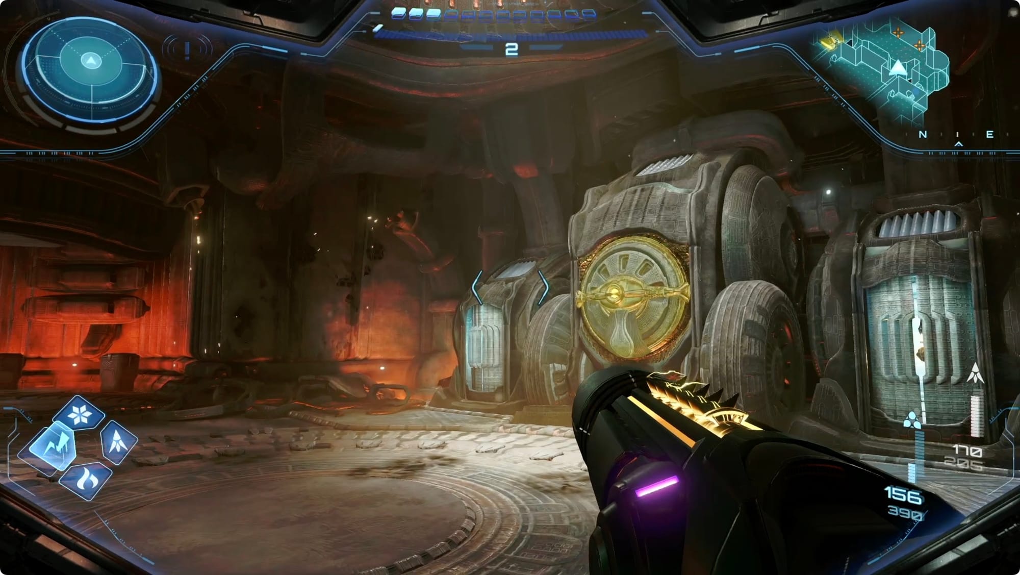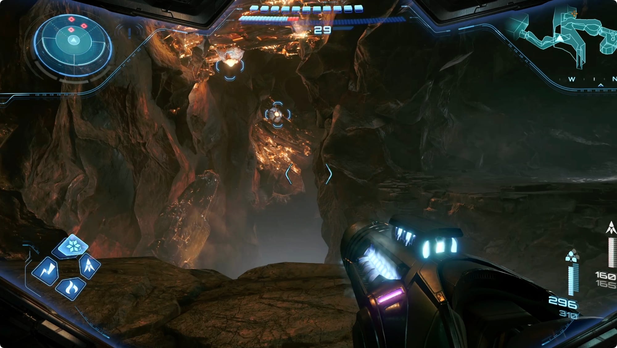 When you exit, turn back toward the room you just crossed and look for the grapple point. Use them to work all the way back across the room where you’ll find a Spinner. Spin it up to turn off the lava flow.