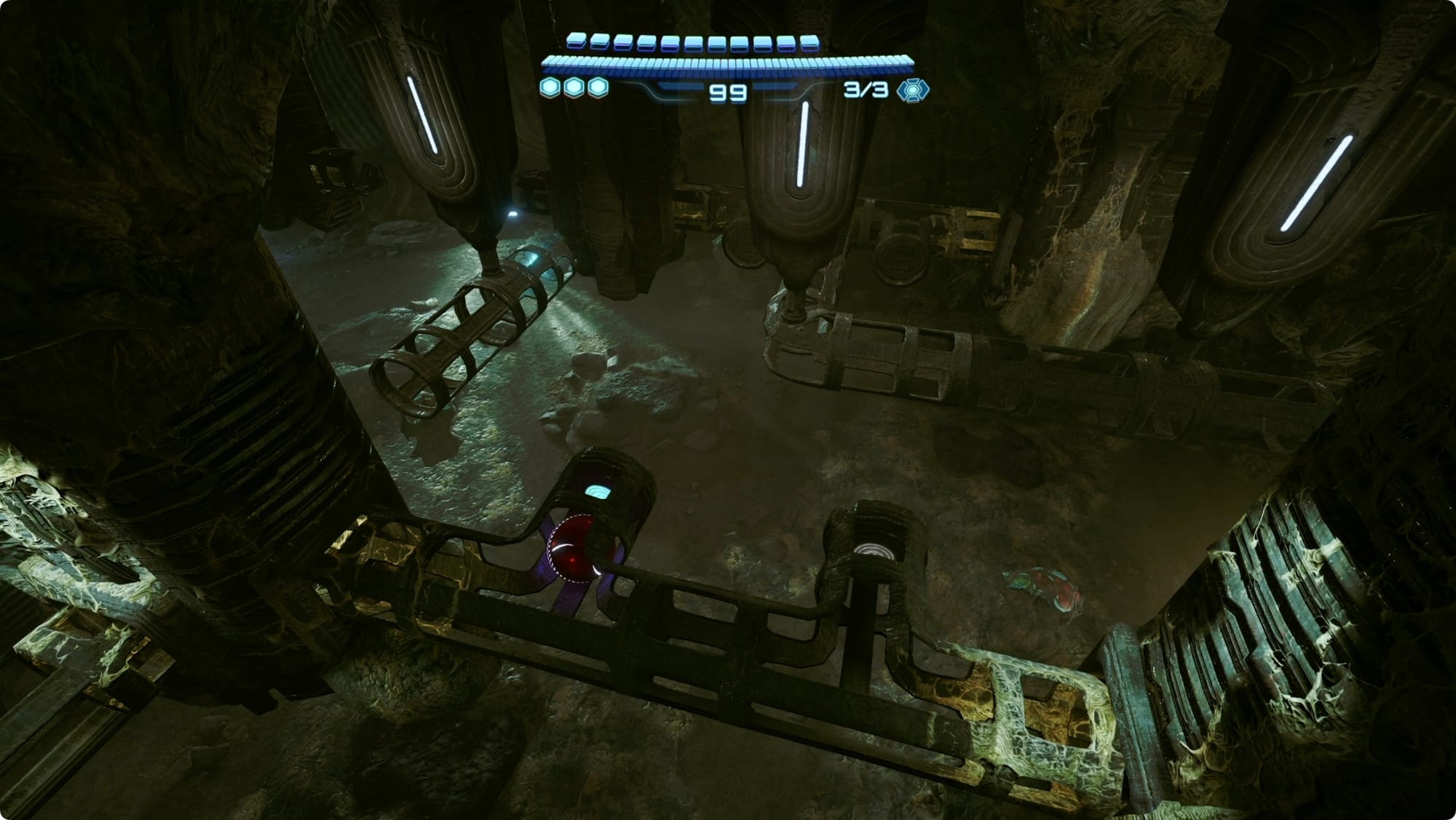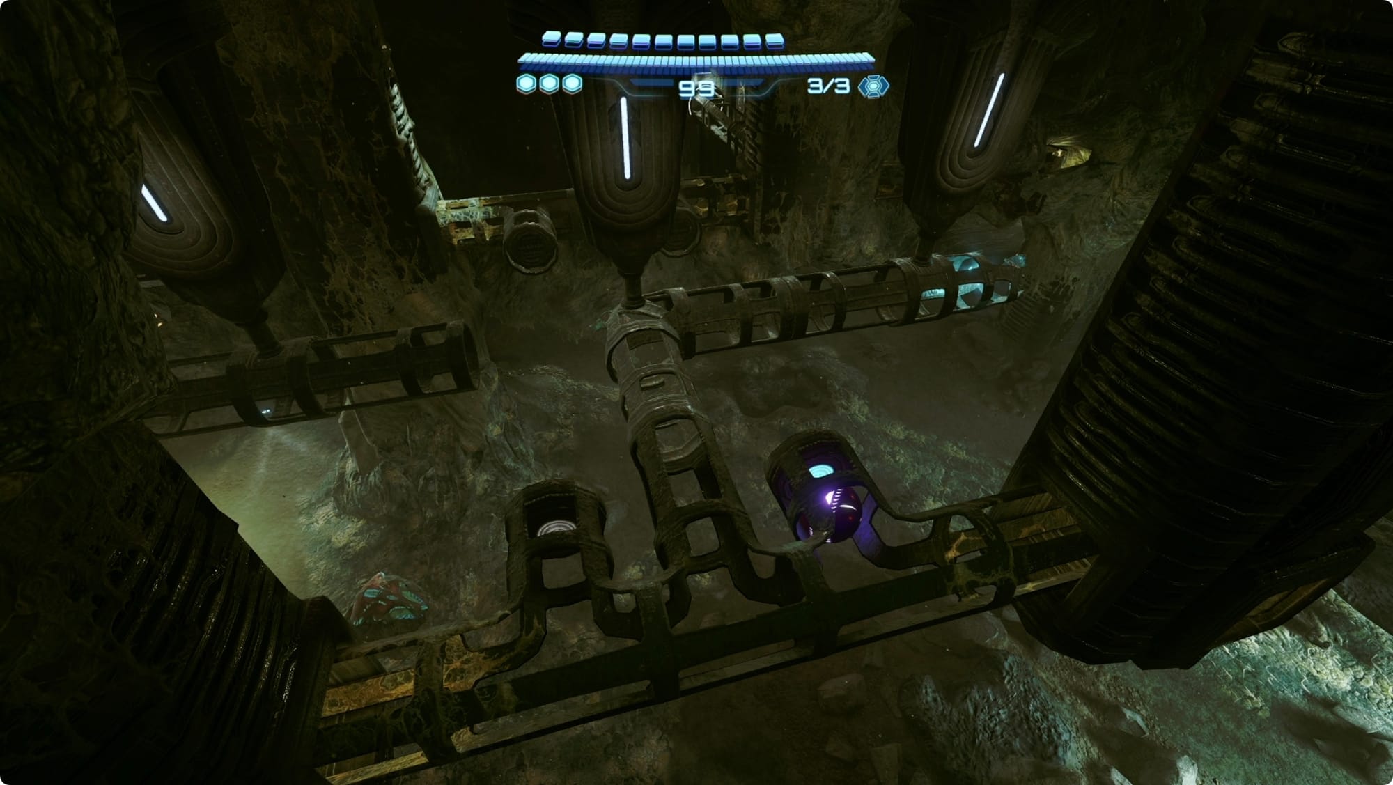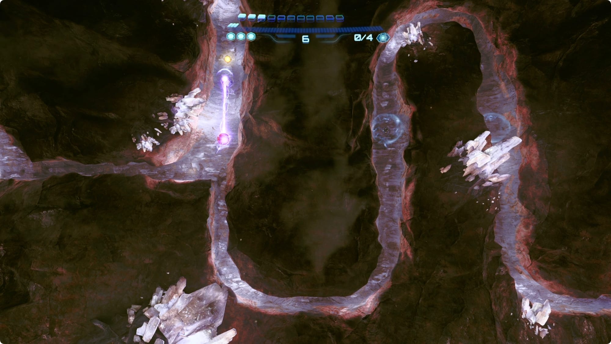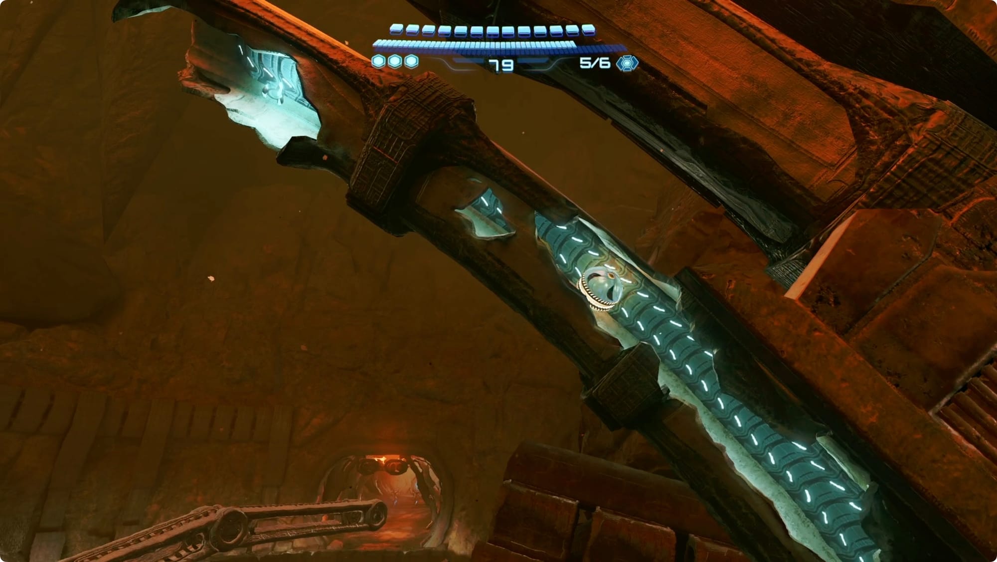 When you leave, look at the arch above the bridge to find a secret Grapple Node. Super Missile the hatch up there, and roll into the tunnel. You’ll grab one more Shot Expansion at the far end.