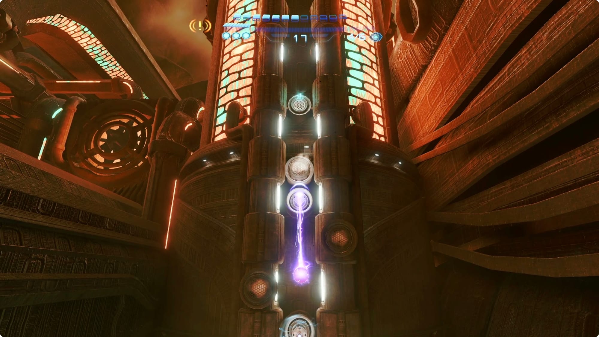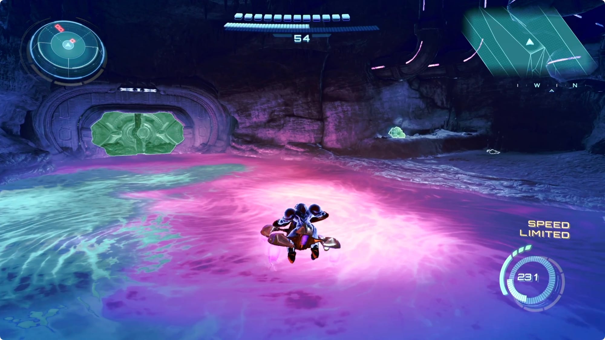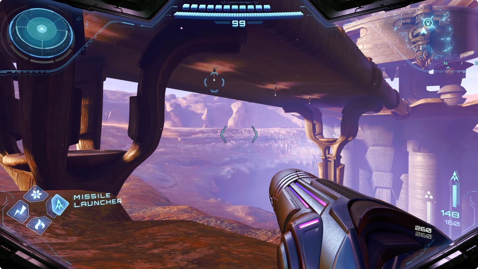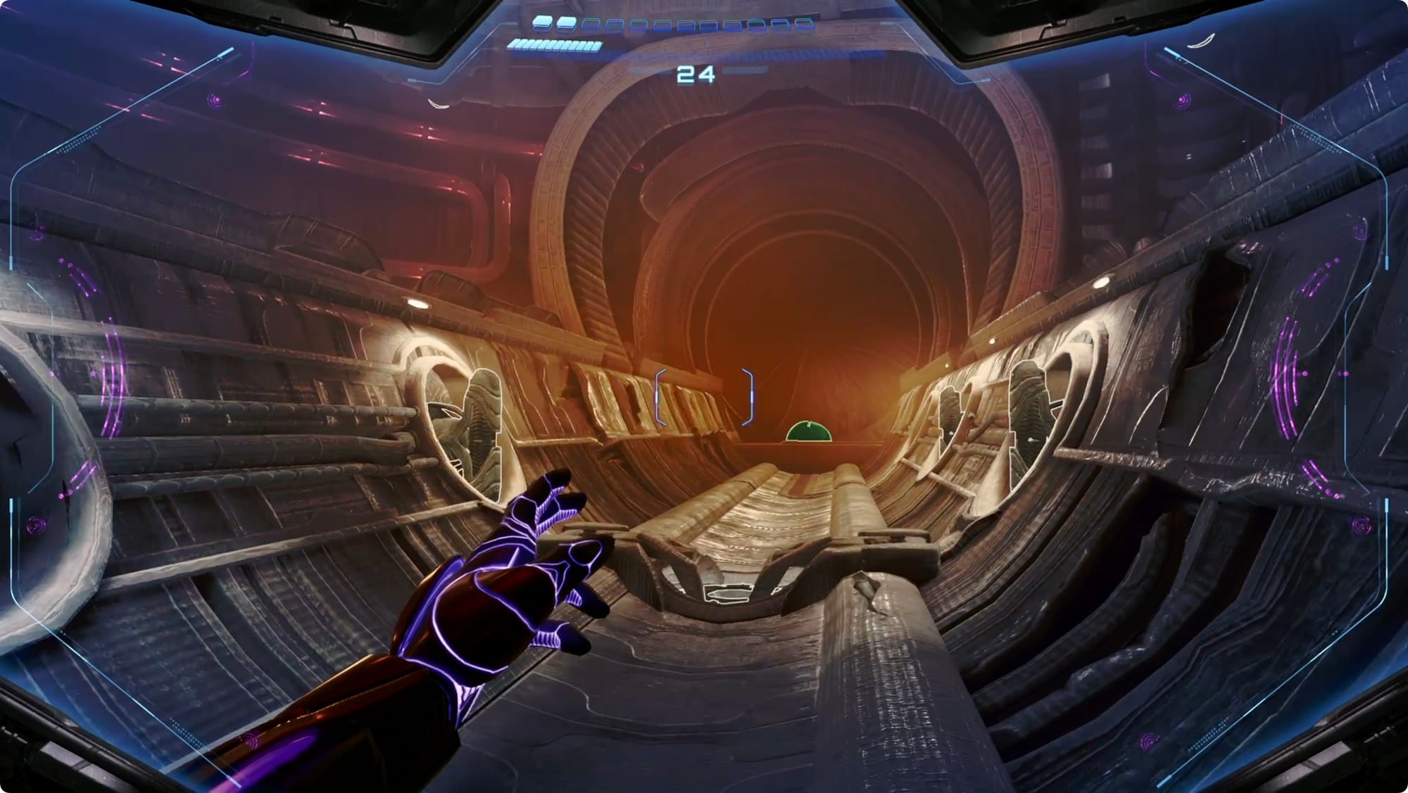 When you leave, look at the arch above the bridge to find a secret Grapple Node. Super Missile the hatch up there, and roll into the tunnel. You’ll grab one more Shot Expansion at the far end.
