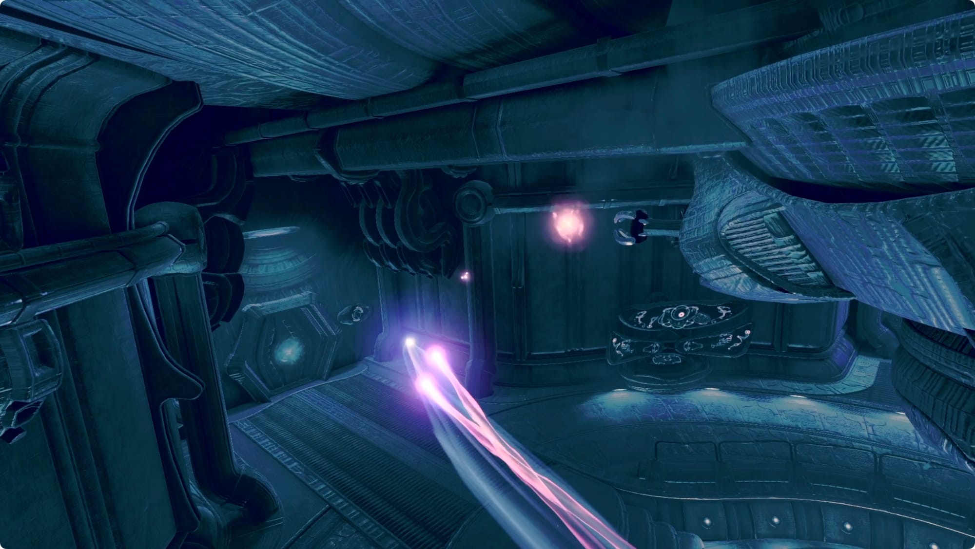 To the left, there’s a couple Grapple Points you can’t quite reach. Double jump out to them and swing across to the far side of the room for a Shot Expansion.
