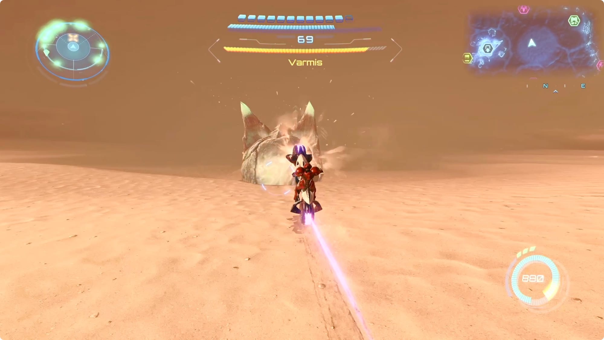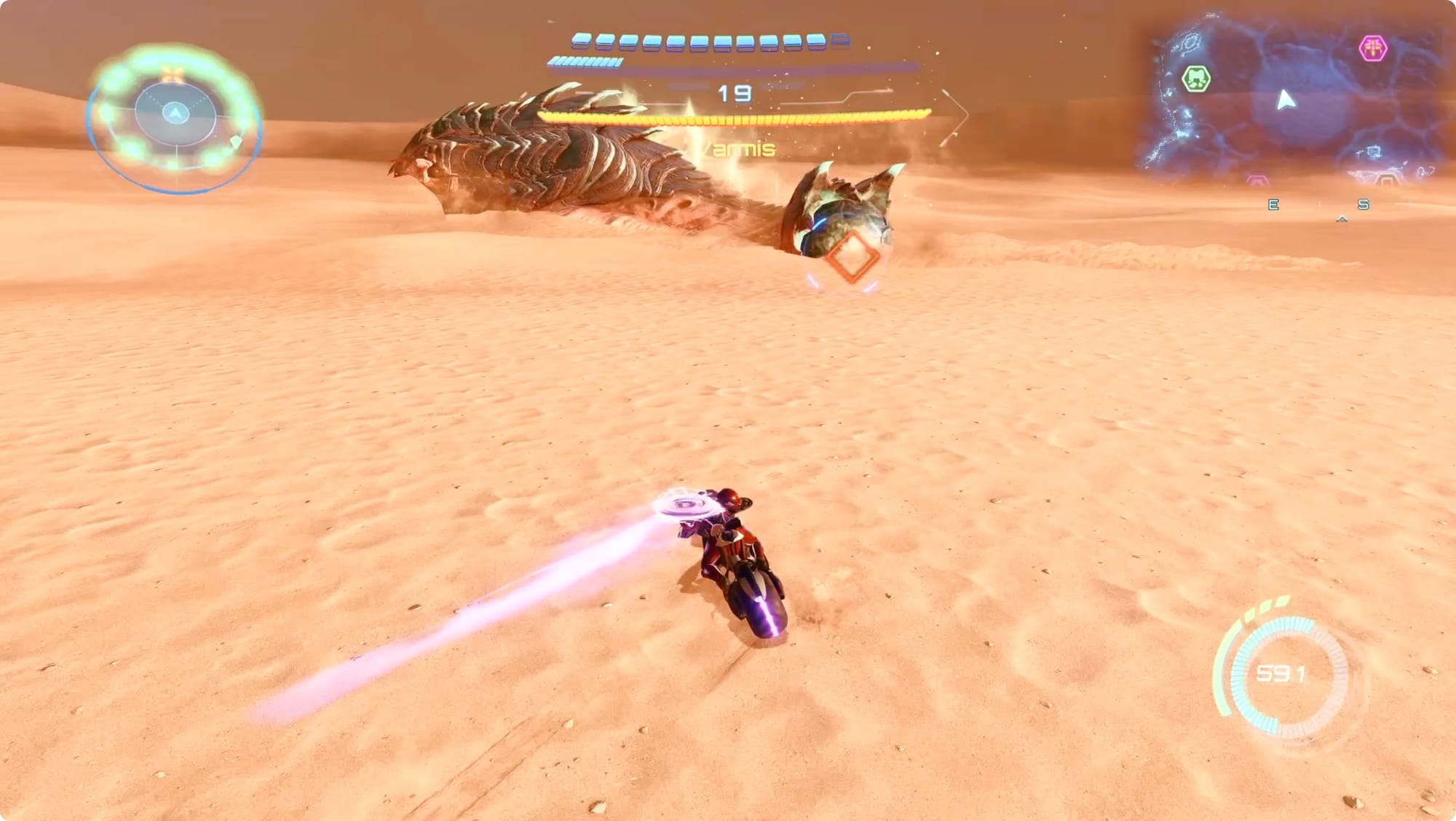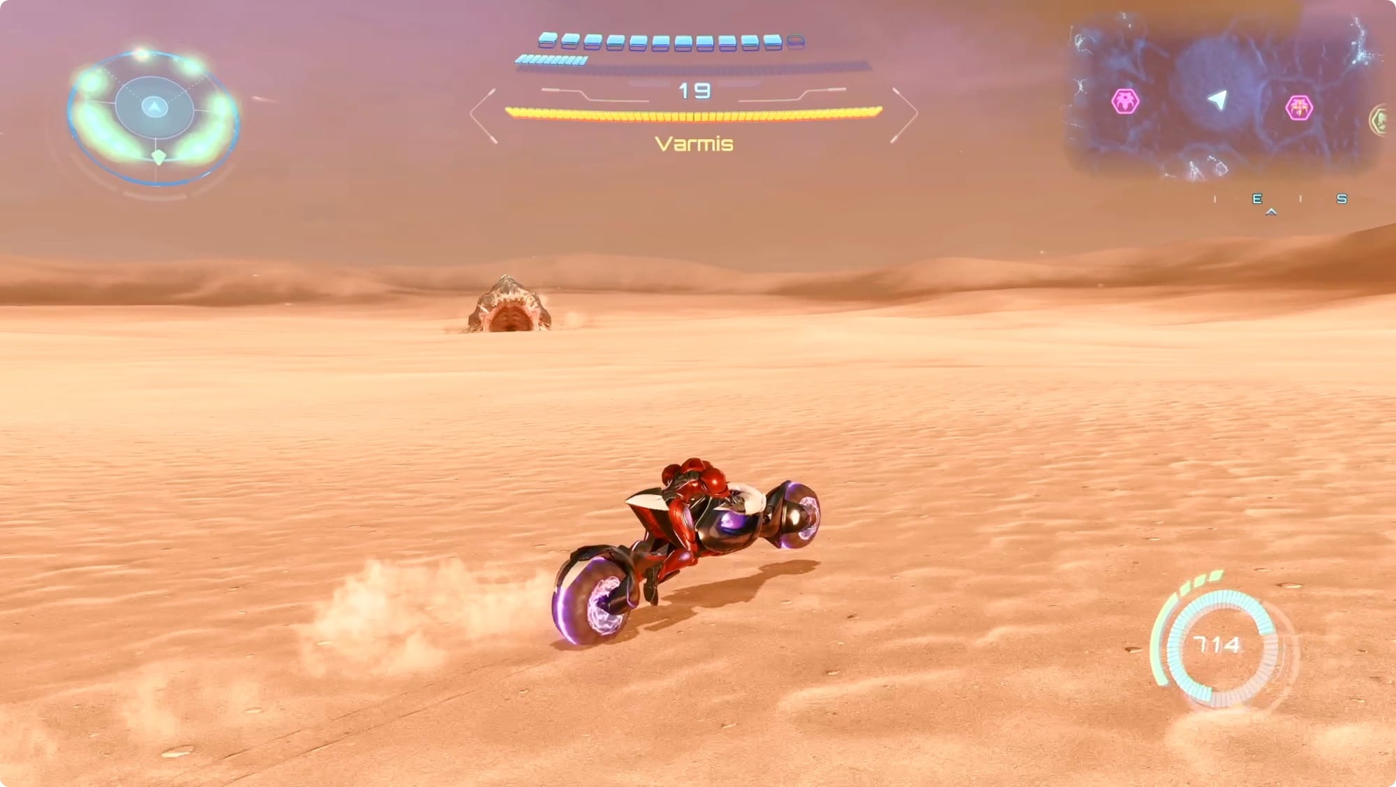 As Varmis passes you, tap the left trigger to slide into a U-turn. When you’re behind Varmis, hold A to target the glowing bulb on its tail. Hitting it doesn’t damage it, but it slows it down.