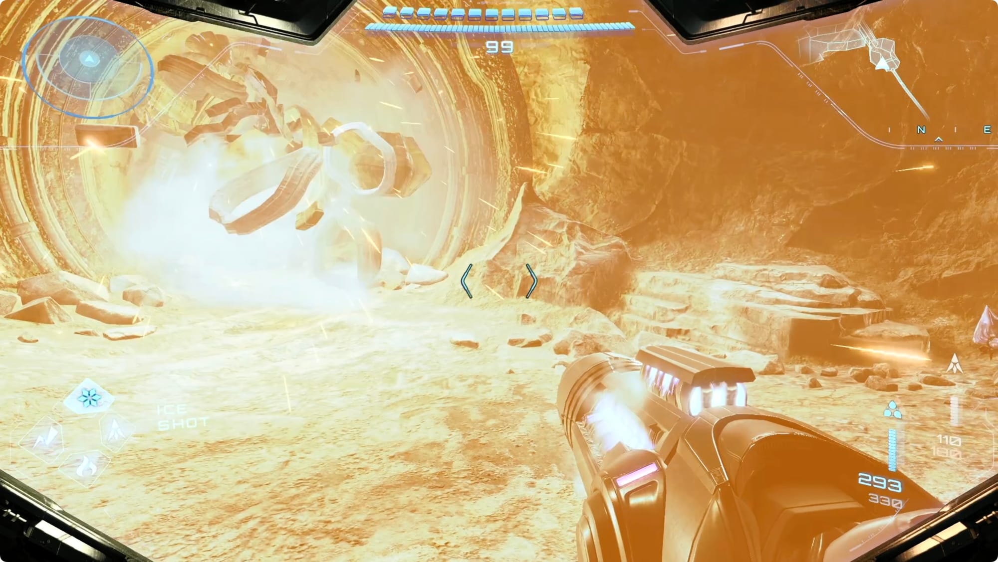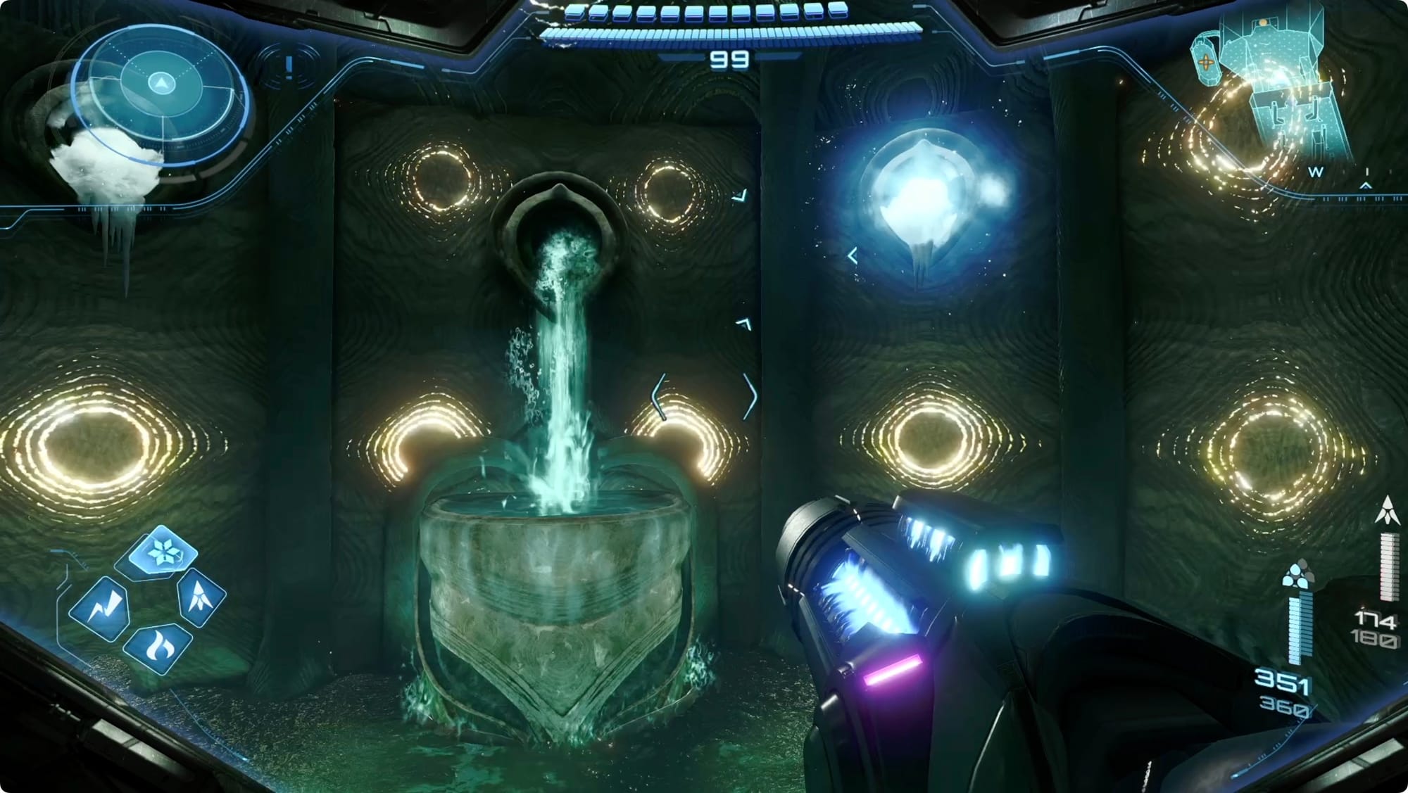 Back out in the main room, Ice Shot the left and right pipes. The extra water in the middle will push down the pillar and reveal the exit. Head through and pick up the Super Ice Shot.