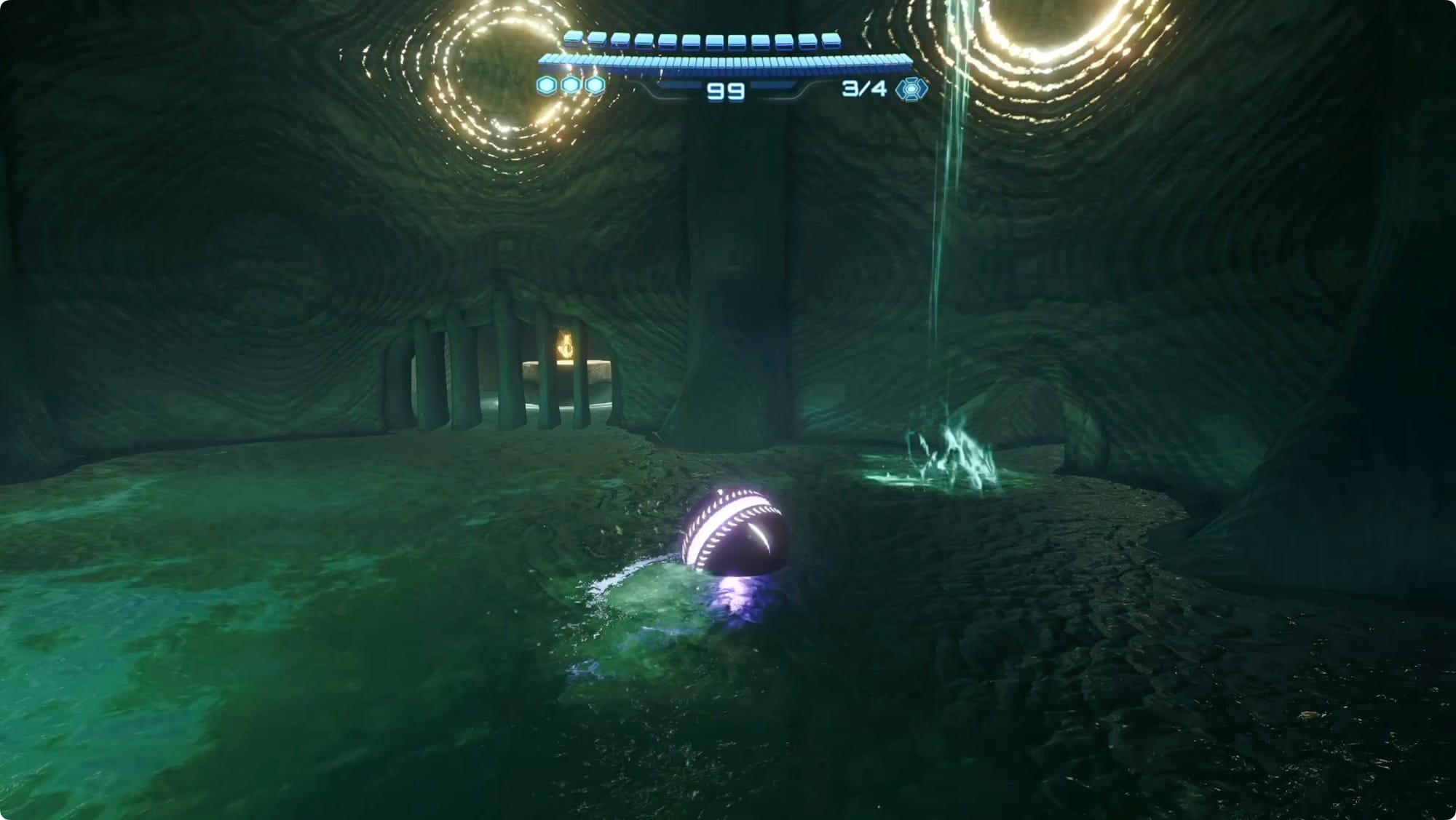 Over on the south side, look for a Missile Expansion behind a column of rock. Just north of the middle of the room, look for a glowing crate. Shoot it to reveal an Energy Tank … that immediately gets stolen by a Swim Snatcher.
