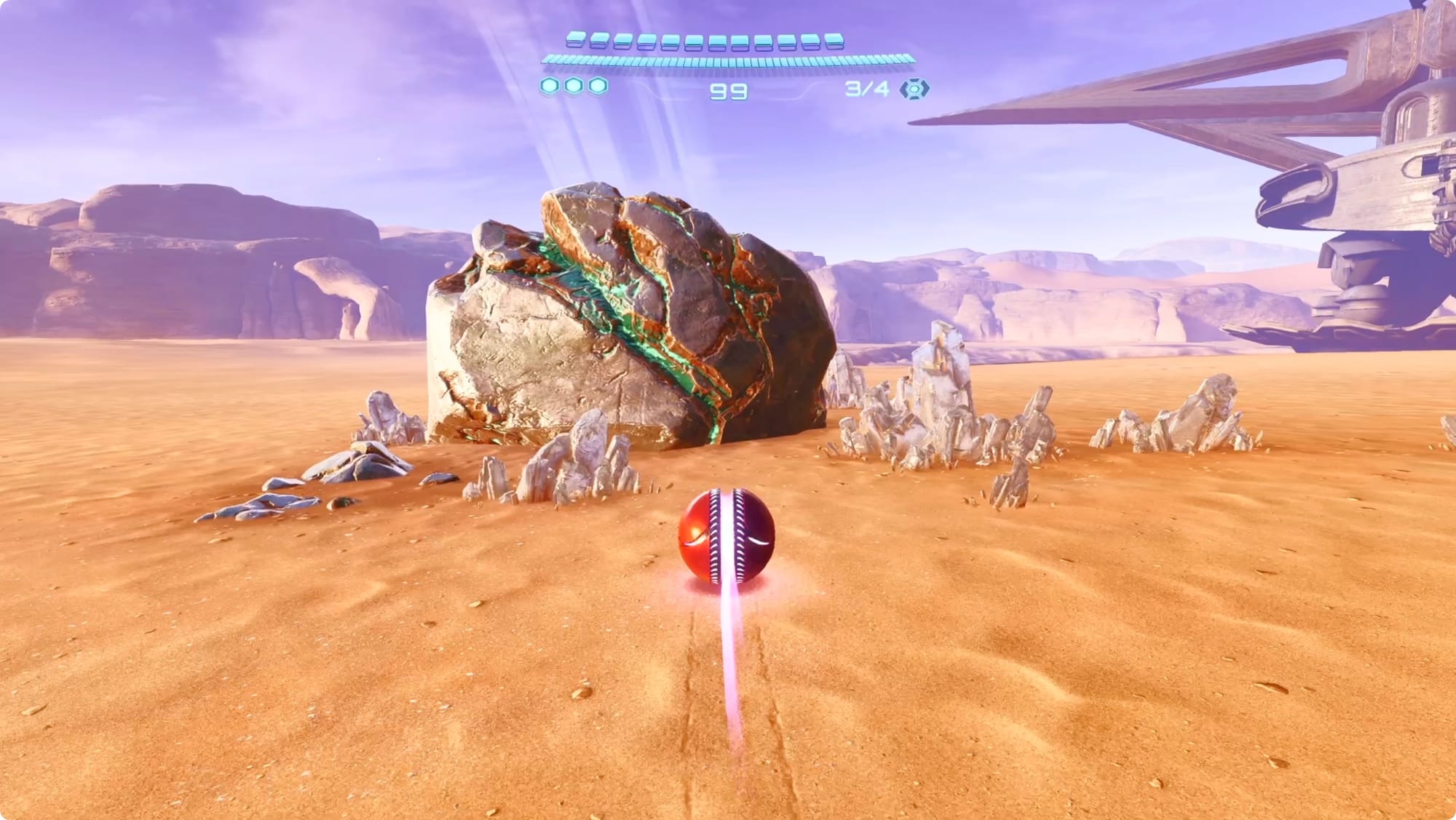 In the next area, you’ll have halfpipe-boost yourself up and over to continue left. Halfpipe-boost again to drop a Bomb against the debris blocking your way up. When it’s destroyed, use the Tether to launch yourself up and follow the path right. Bomb more debris, and then use the jump-Bomb-jump trick to double jump up to the Energy Tank.