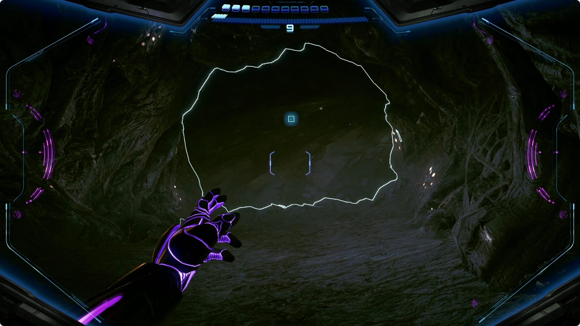 Follow along until you hit the Main Nest Tunnel. This time, go to the south end where you’ll find a wall. Power Bomb it and continue through the door. Burn the webbing on the wall, and then roll into the tunnel. Follow along until you hit a Tether. Use it to launch up and drop a Bomb. When you destroy the wall on the left, Tether yourself up again and roll through.