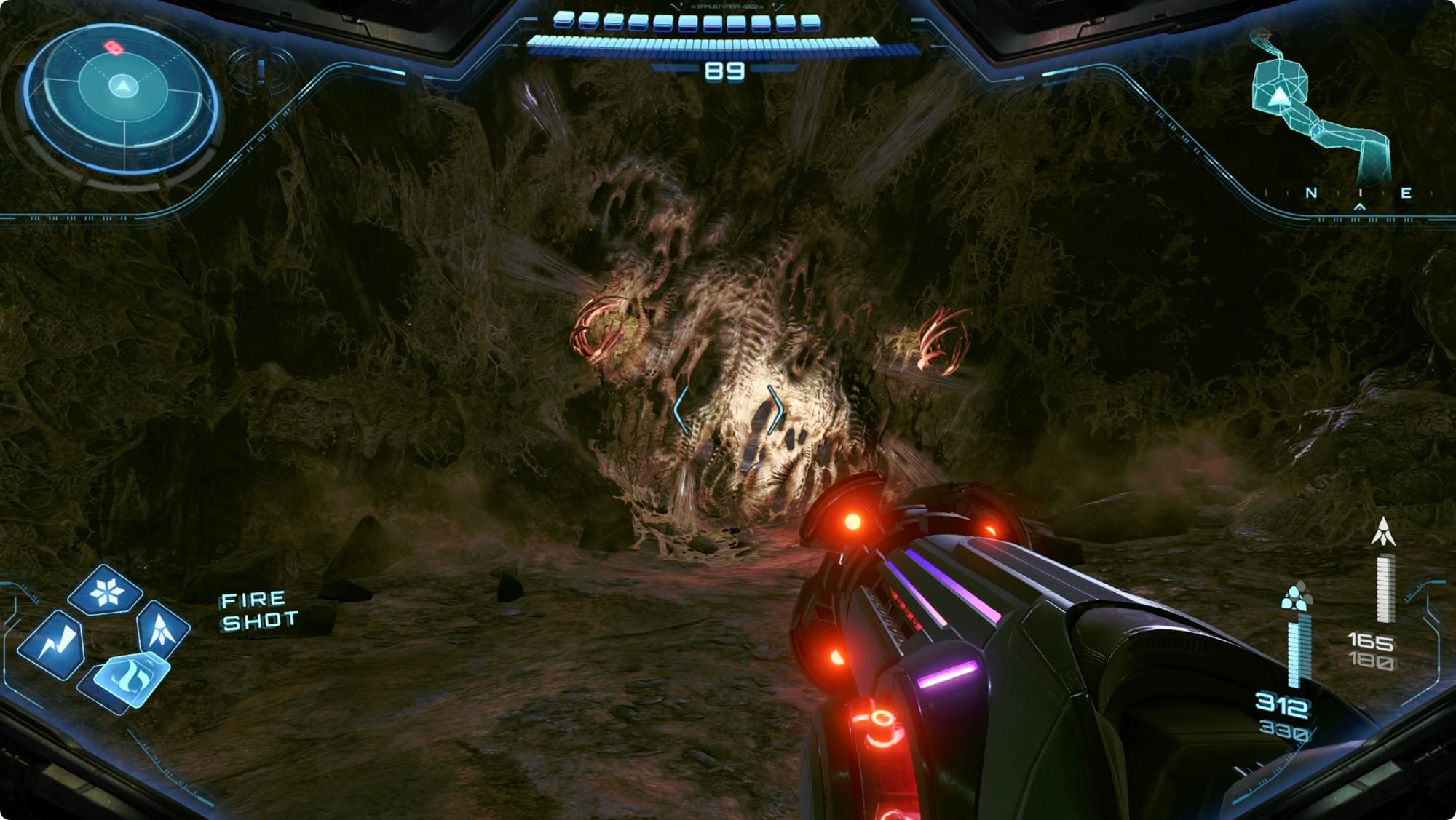 Now you’re heading back to Base Camp. Backtrack to the Cargo Launcher. This time, take a left at the tunnels. Burn through the webs to eventually reach a Shot Expansion.