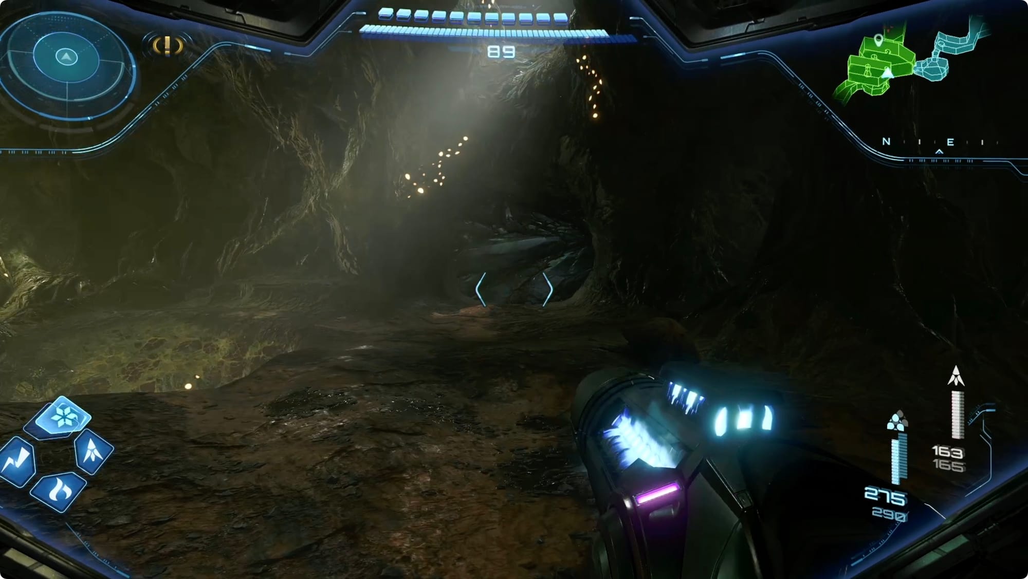 Back in the main room, drop through the hole and continue all the way forward to Level 2 of the mines. Continue forward to the Narrow Crevice where you have to jump a gap. When you do, turn around and look to your left. Use the three Crystal Crawlers to go deeper into the Crevice for a Missile Expansion.