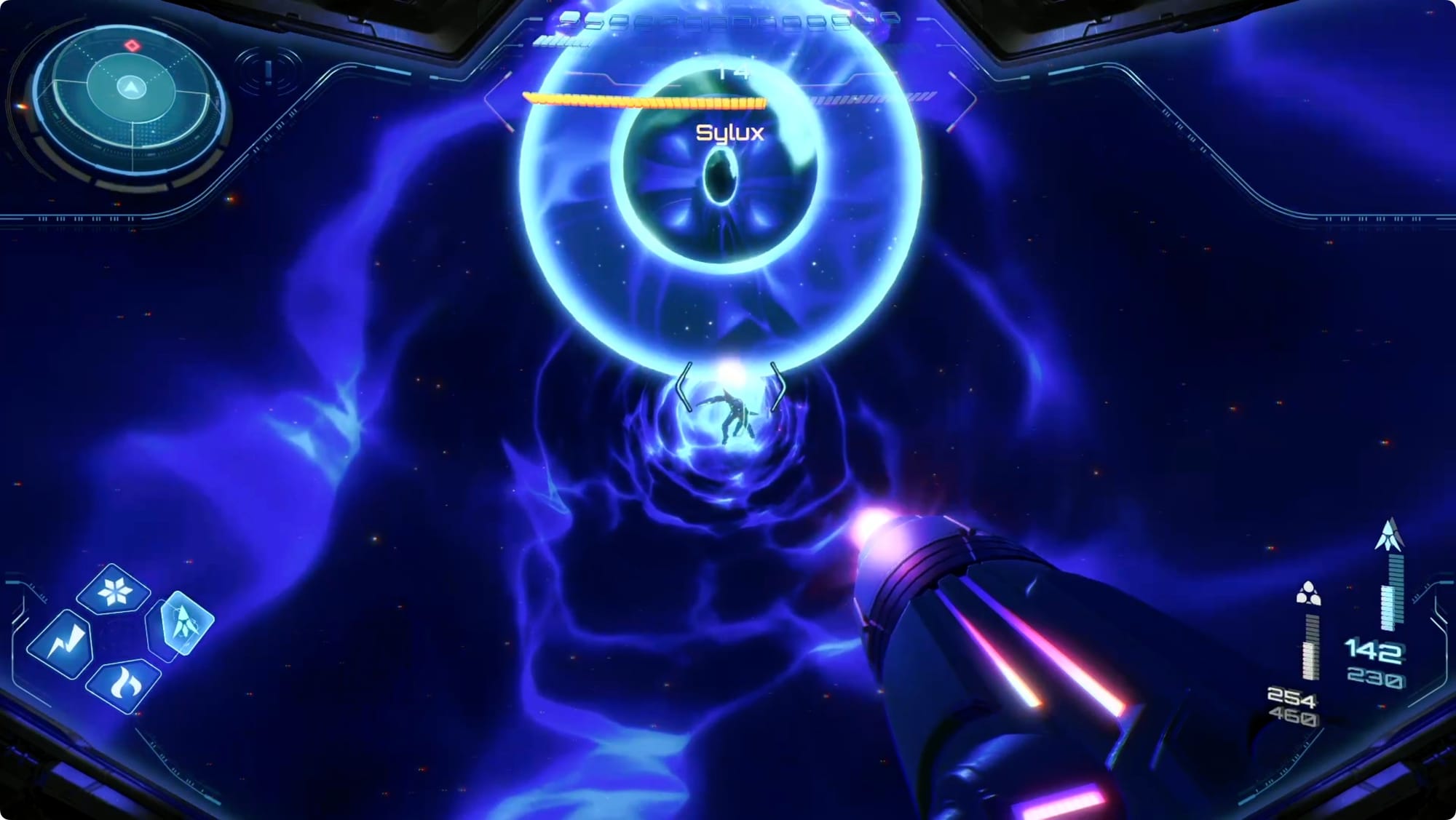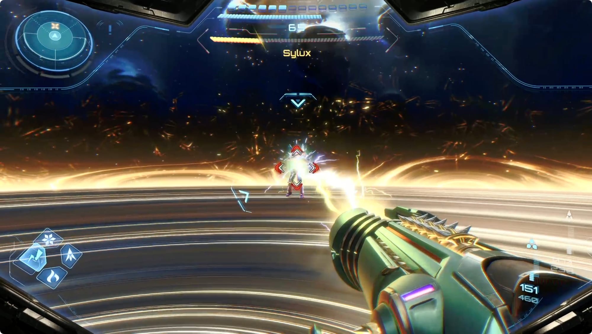 He’ll also occasionally summon a pair of rotating beams. When this happens, switch to scanner and fire a Control Beam between them to hit Sylux.